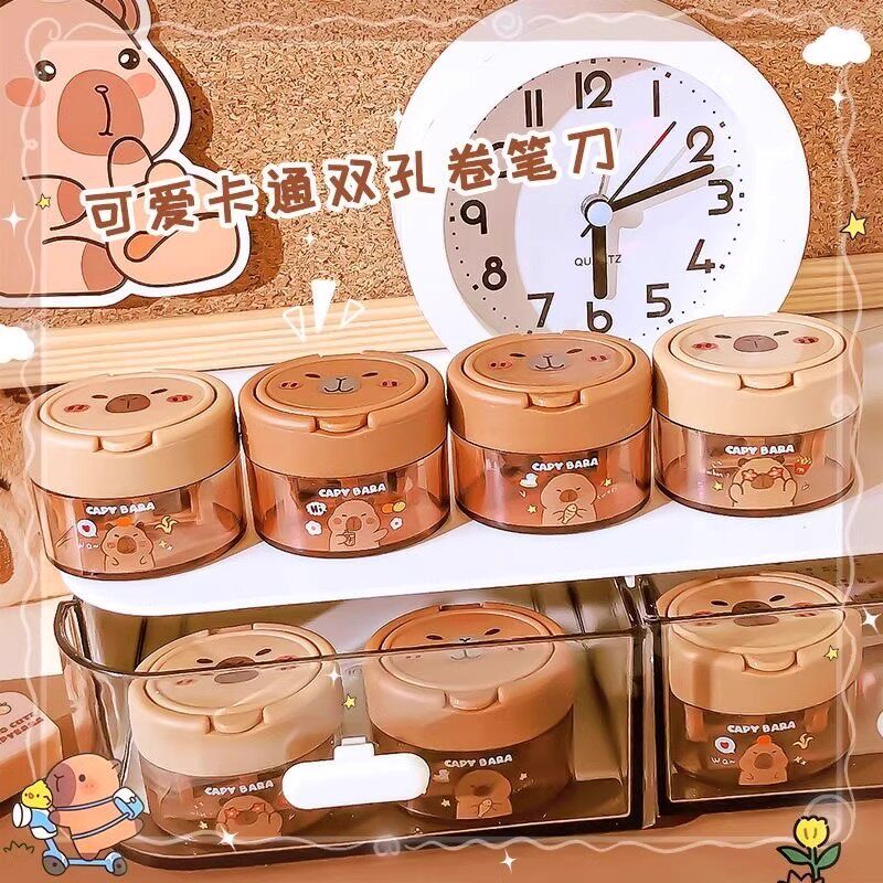 儿童铅笔卷笔刀卡皮巴拉转笔刀手动旋转削笔器卡通手动带盖双孔