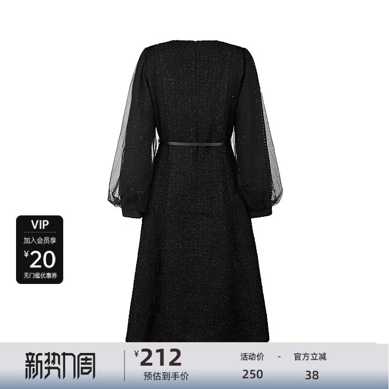 sdeer圣迪奥女装圆领收腰网纱泡泡袖毛呢连衣裙S224Z1283