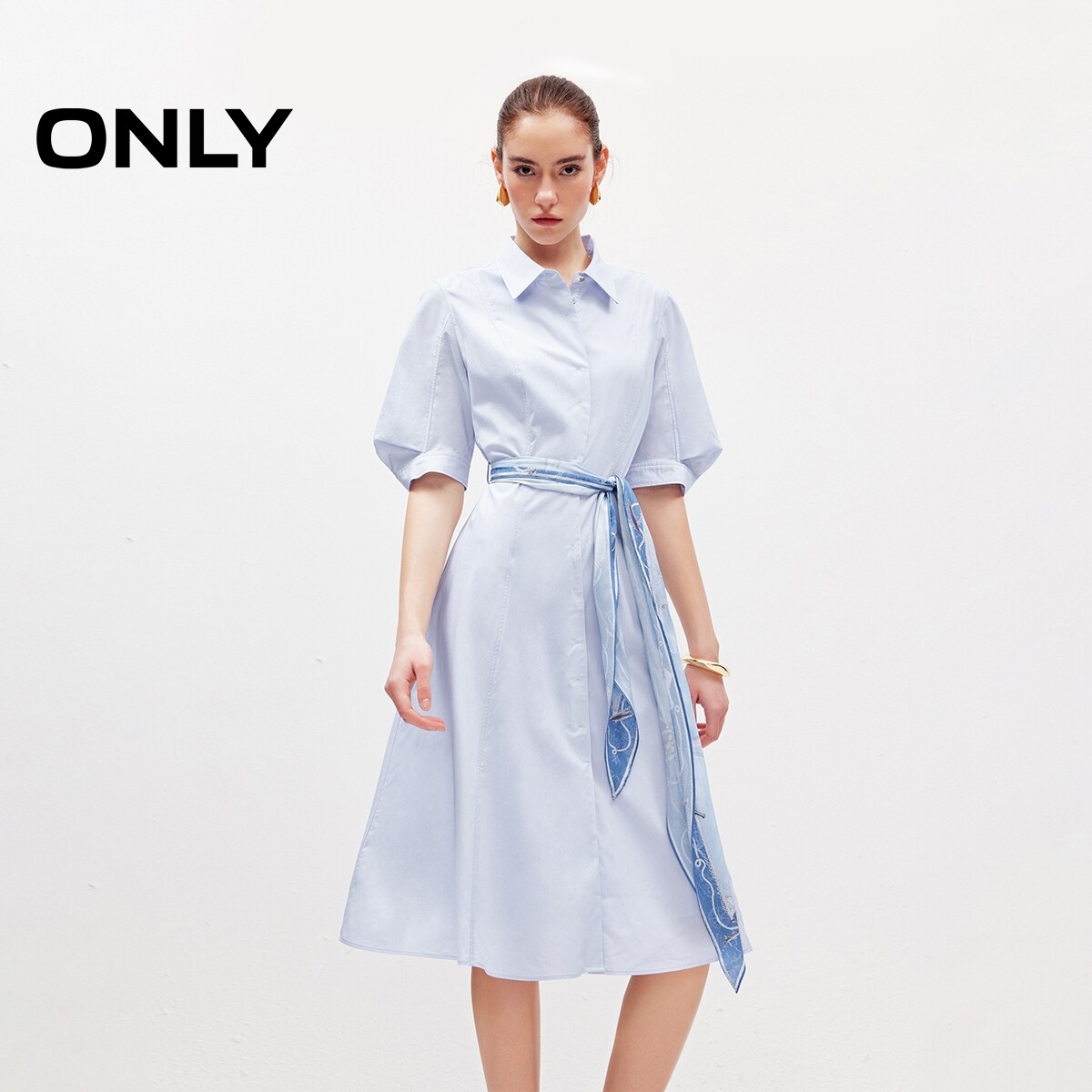 ONLY2026春季新款莱赛尔泡泡袖丝巾装饰中长收腰衬衫白色连衣裙子
