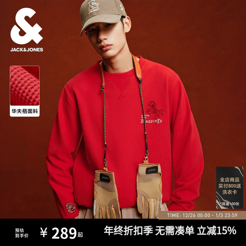 【马年新年款】杰克琼斯男装华夫格面料红色水洗卫衣男刺绣本命年