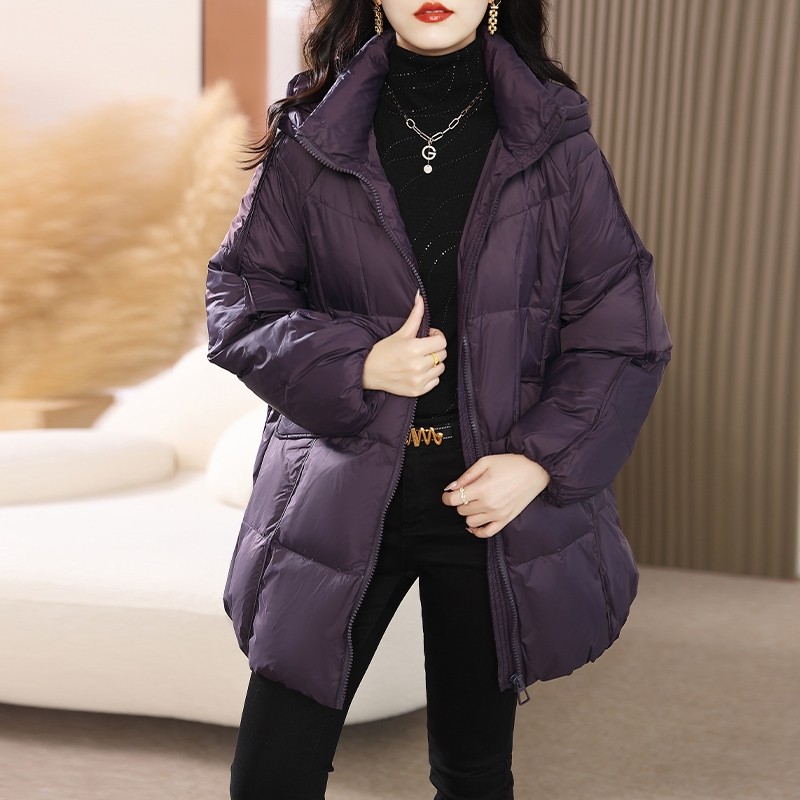 户外紫色羽绒服外套女冬2025年新款高端显瘦中长款连帽面黑色红色