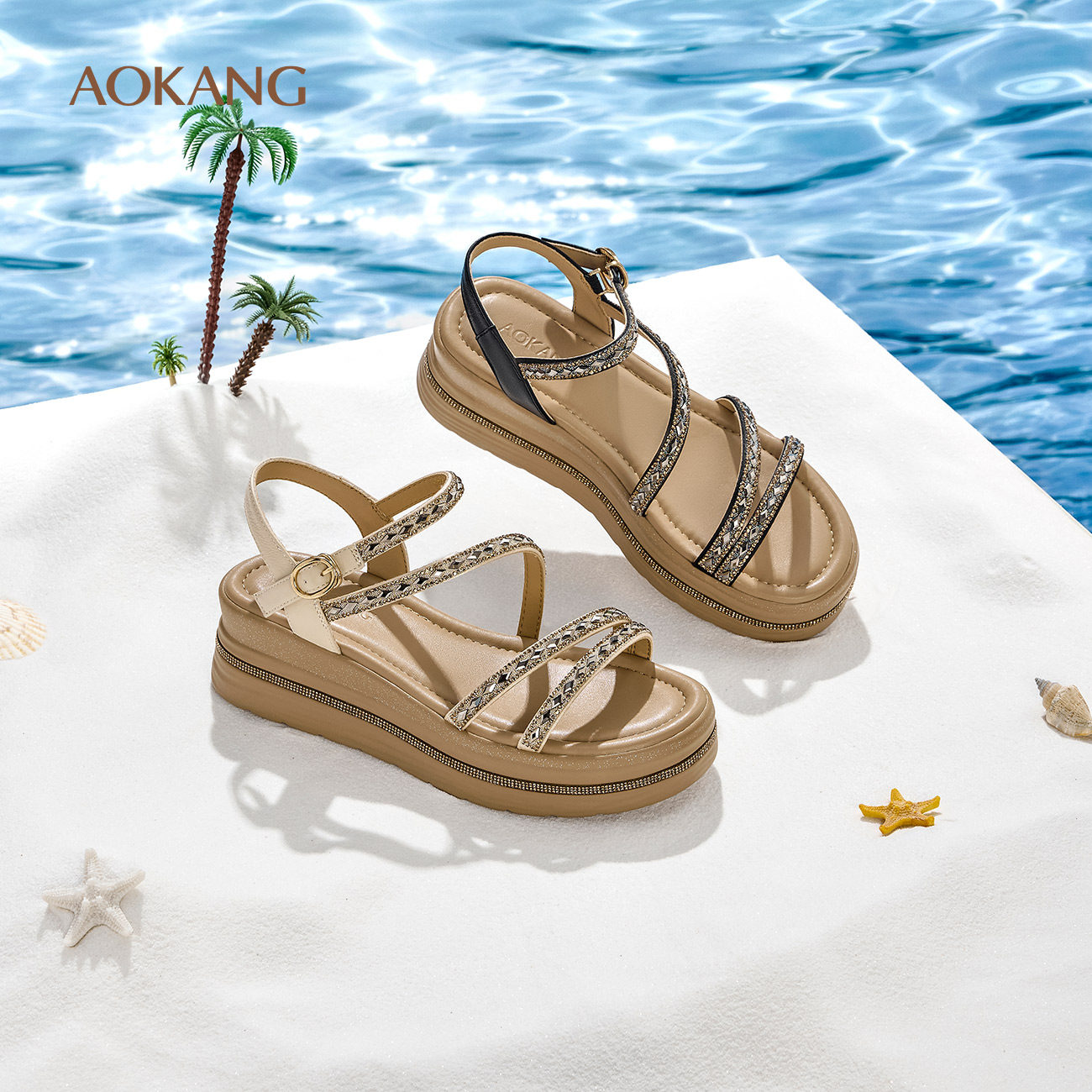 奥康 女鞋夏季凉鞋时装一字带水钻时尚小坡跟厚底增高凉拖