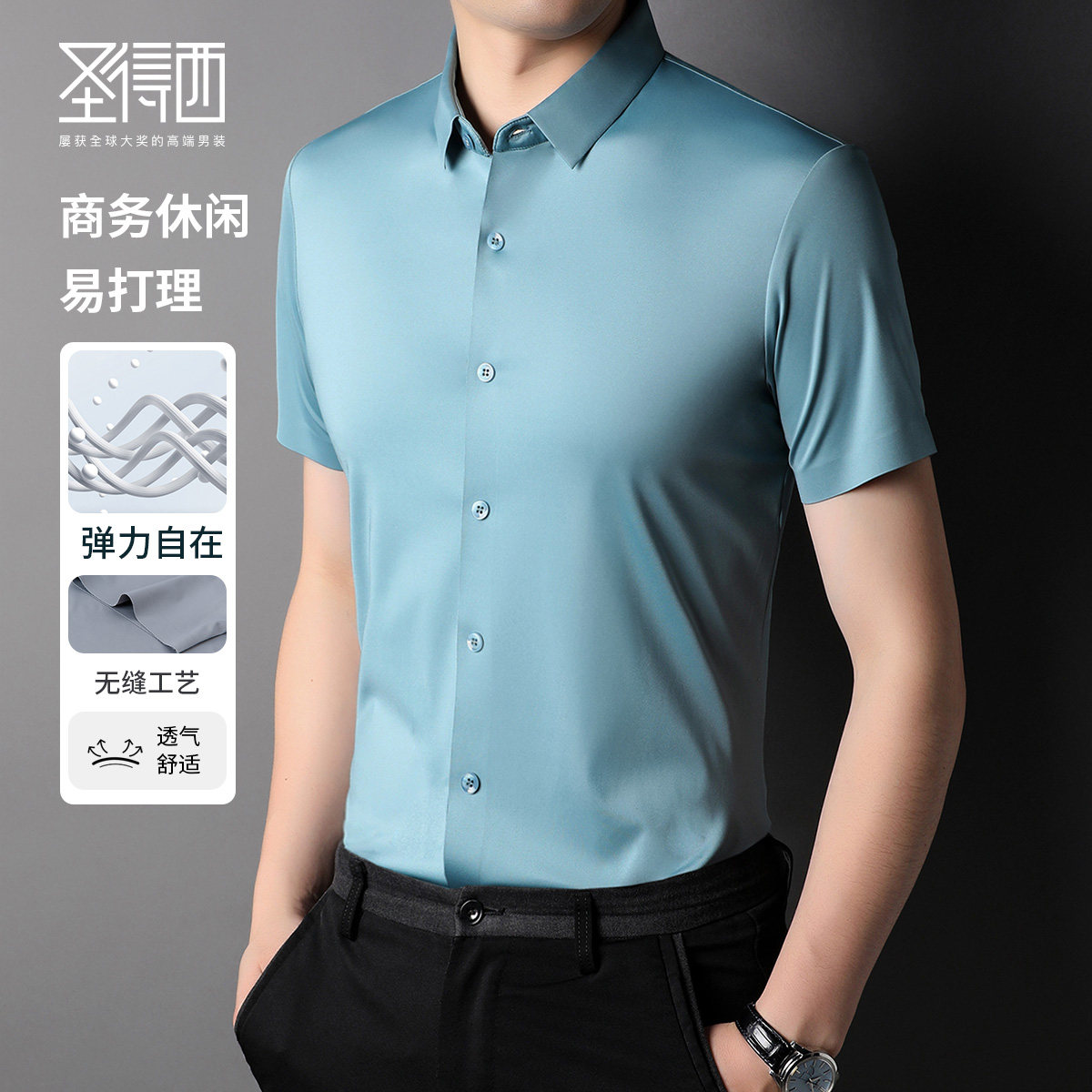 【冰丝易打理】圣得西男士短袖衬衫2025年夏季新款无痕弹力衬衣潮