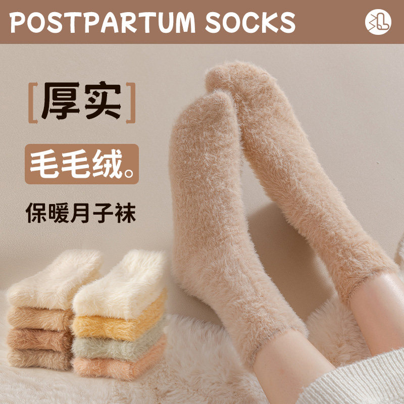 珊瑚绒月子袜子女中筒产后秋冬季加绒加厚冬天保暖睡眠毛巾地板袜