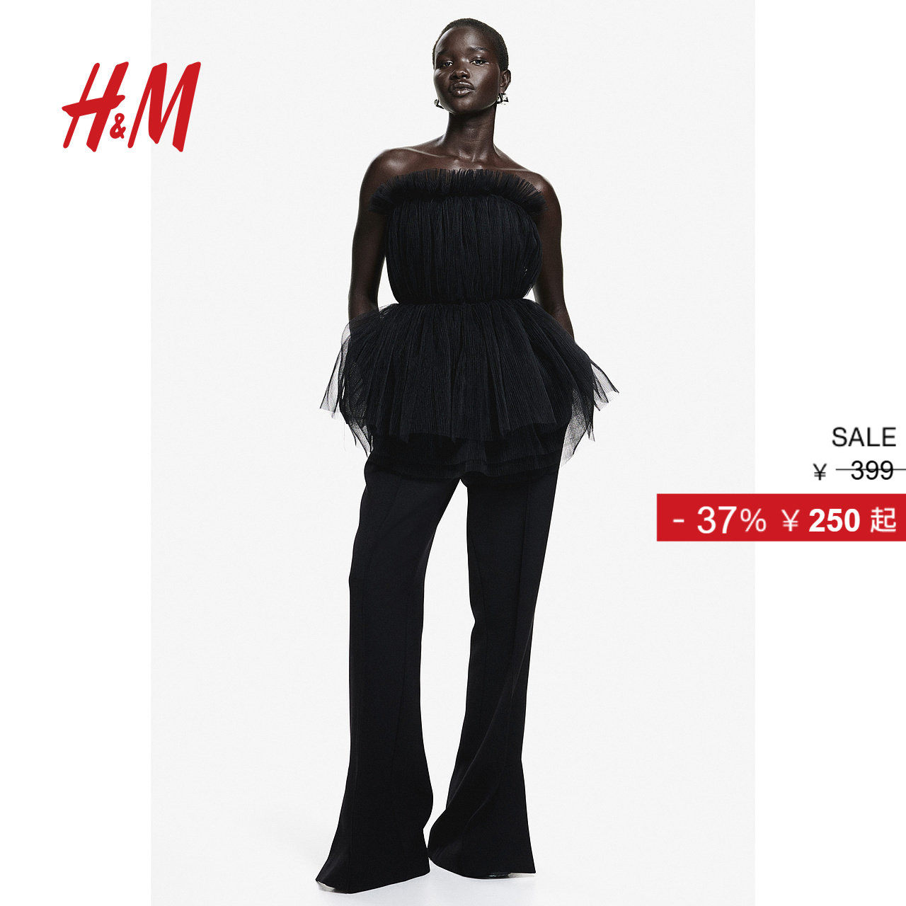 HM女装抹胸秋季无袖一字肩礼服潮流褶裥薄纱收腰露背上衣1265956