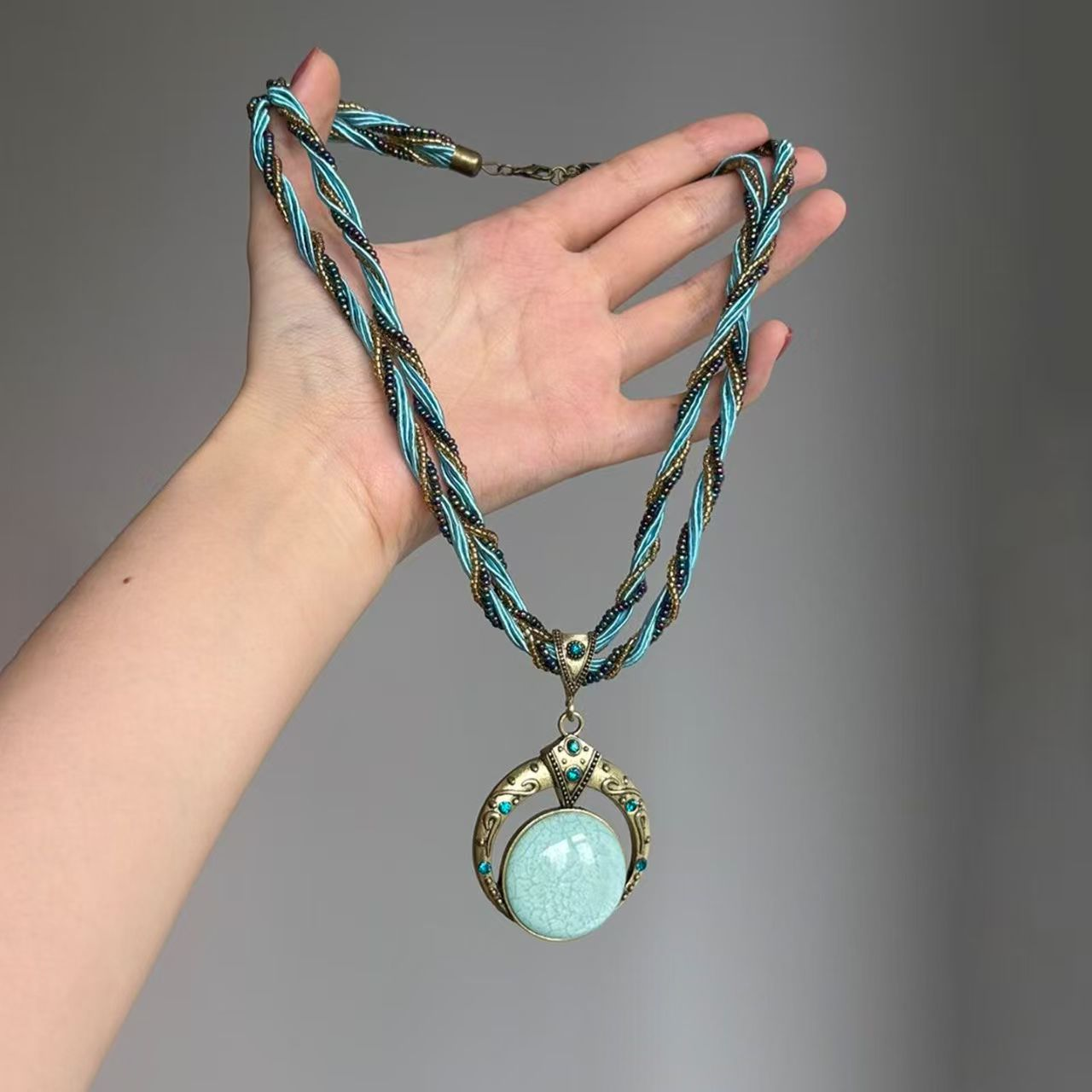 【寻光】波西米亚中古蓝色麻花米珠项链女小众民族风古铜镜锁骨链