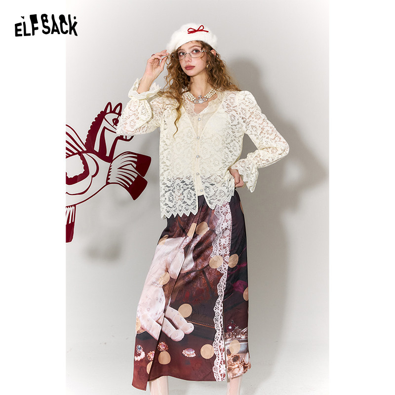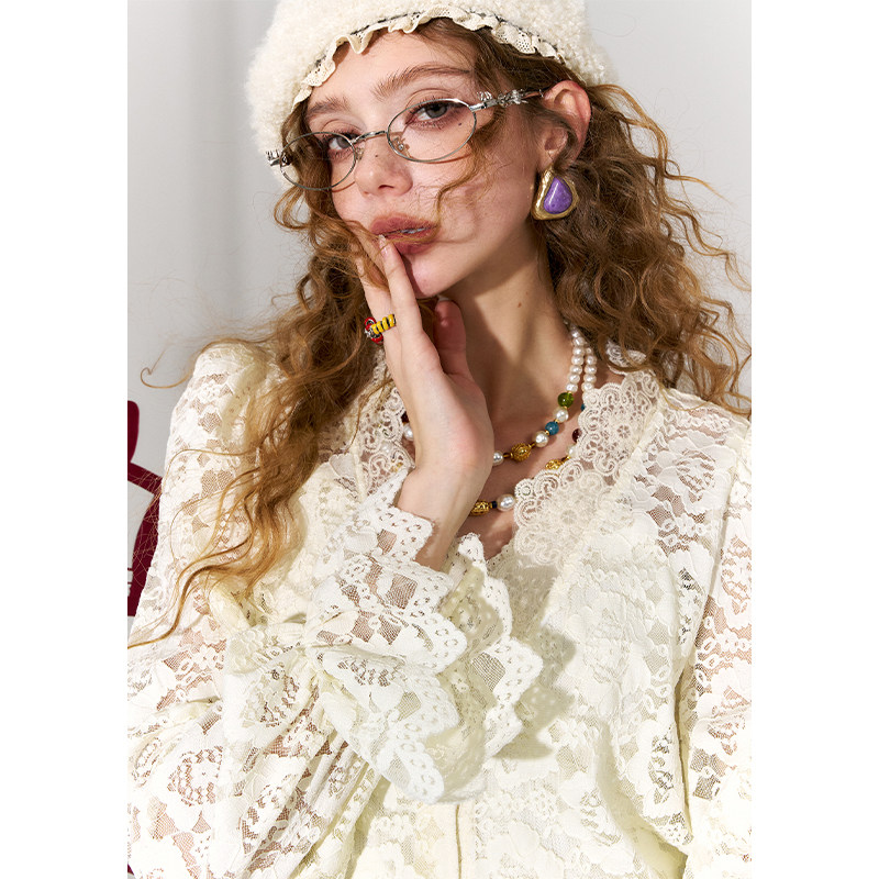 妖精的口袋白色v领镂空蕾丝衫女2026年春新款高级感气质叠穿上衣