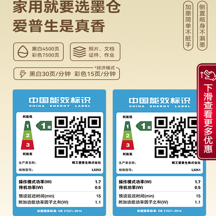 【政府补贴减20%】爱普生彩色打印机L3251/3256/3556/1259家用小型epson无线墨仓复印扫描学生照片办公一体机