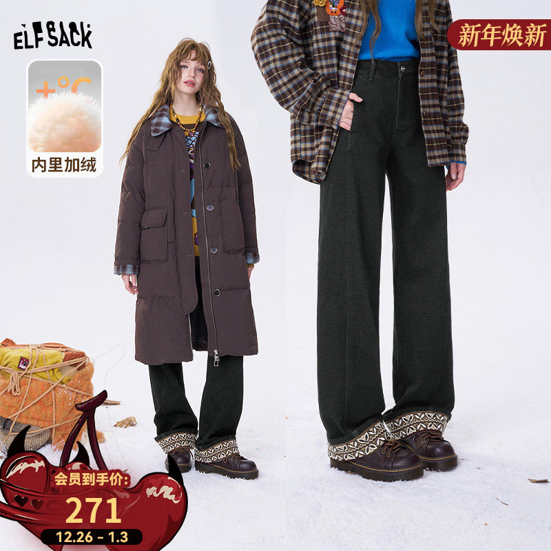 妖精的口袋复古民族风撞色直筒加绒牛仔裤女2025冬季新款高腰裤子