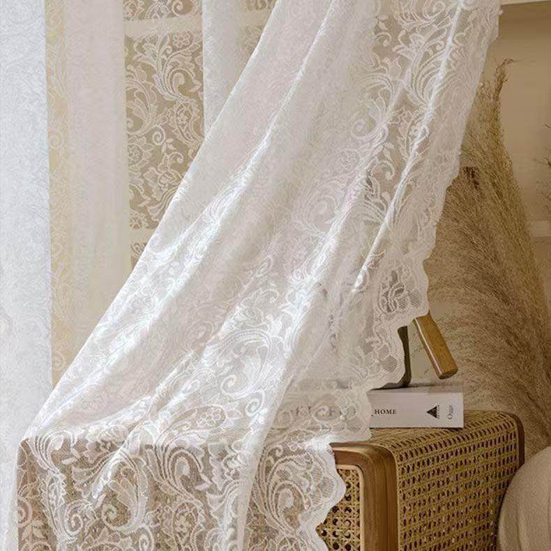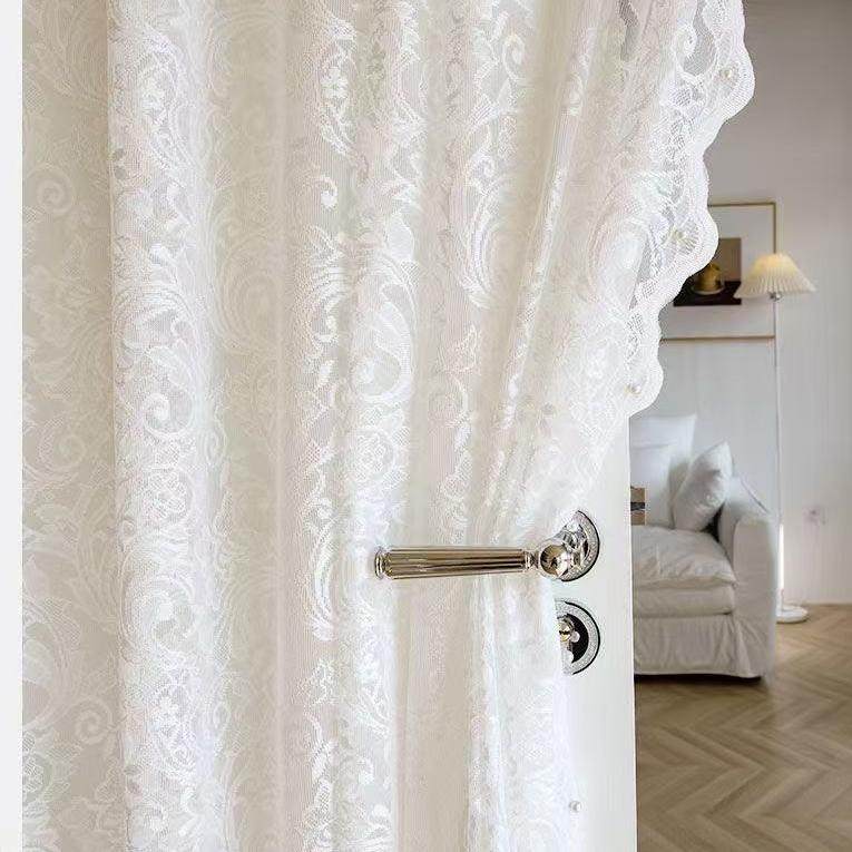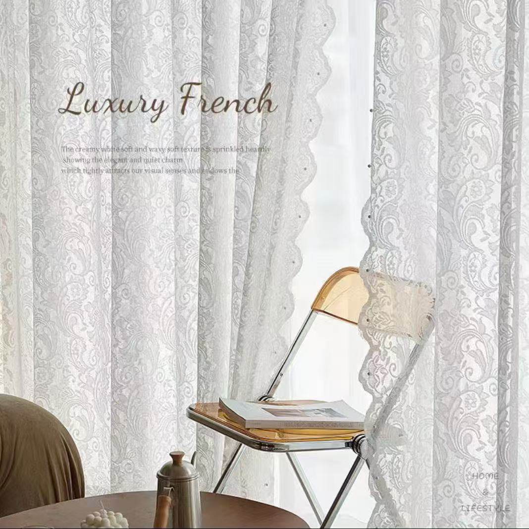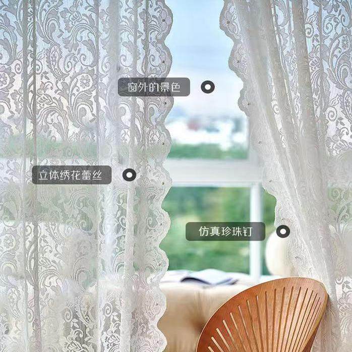 法式遮光门帘蕾丝花边窗帘卧室客厅阳台免打孔钉珠透光飘窗折叠