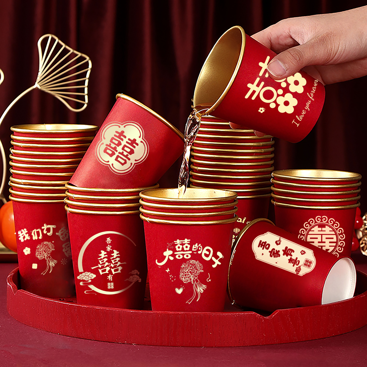 结婚一次性金箔加厚纸杯子婚礼订婚喜杯婚宴家用红色敬茶杯实用