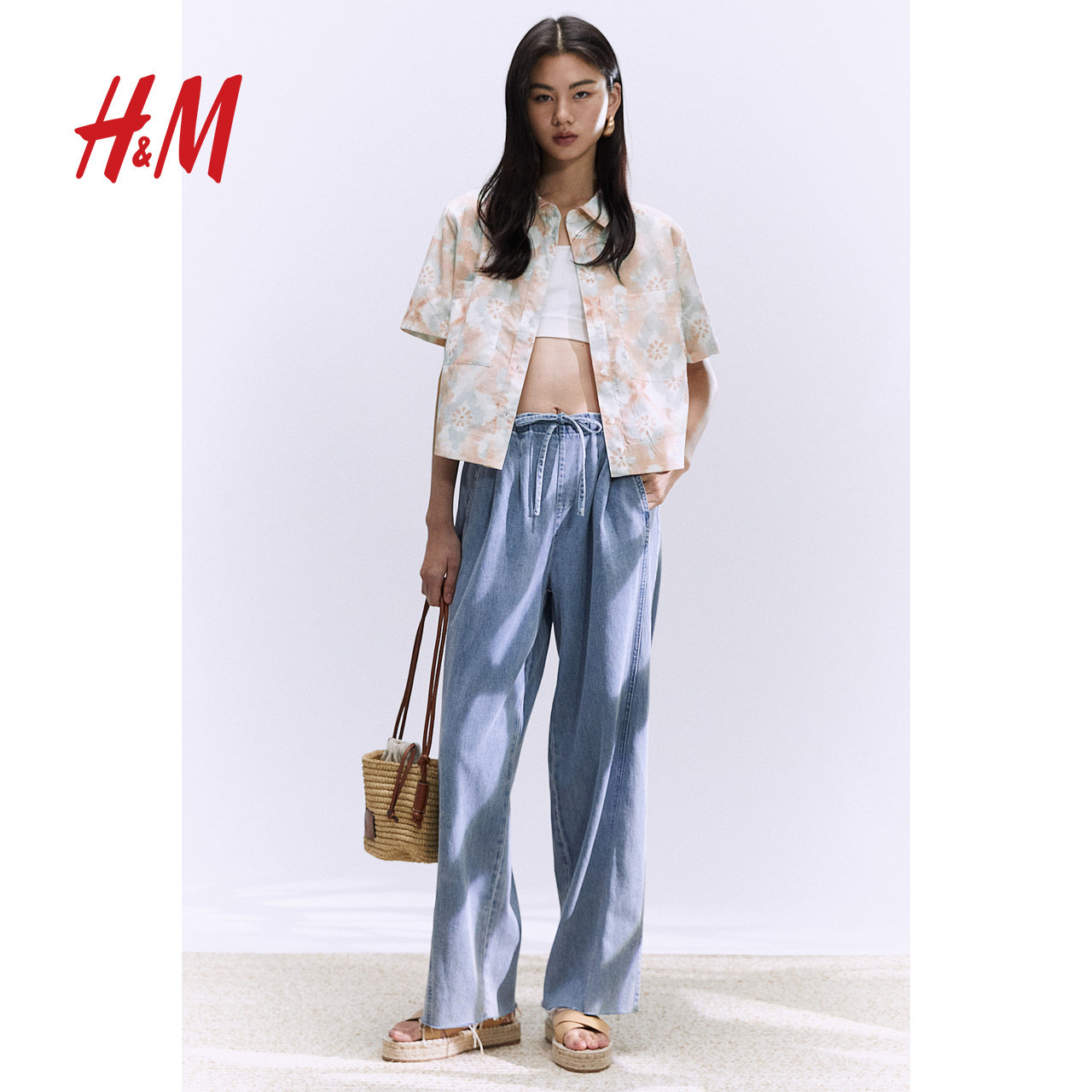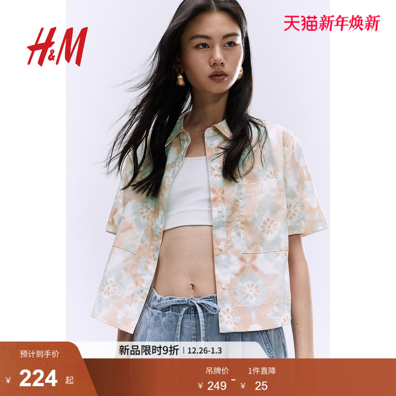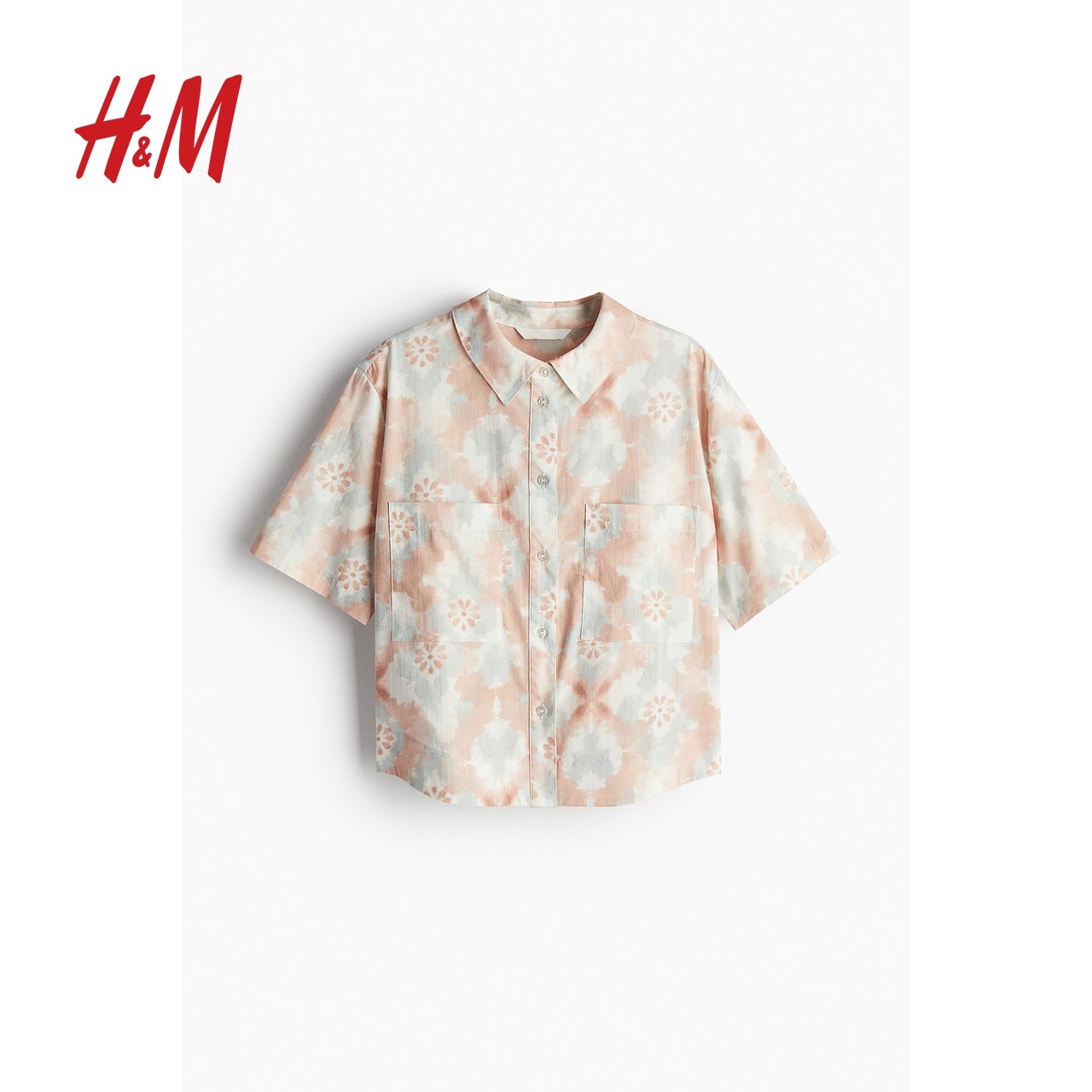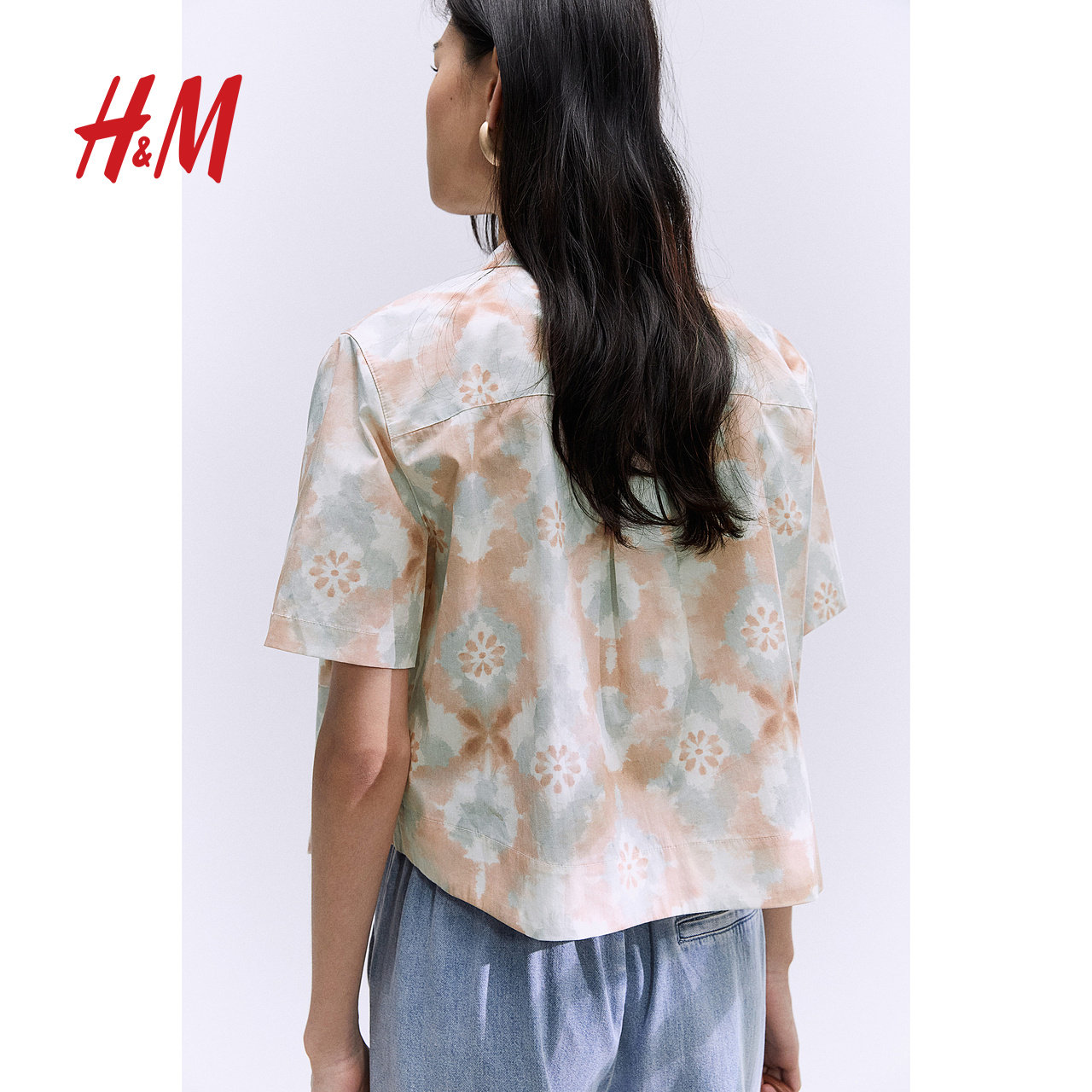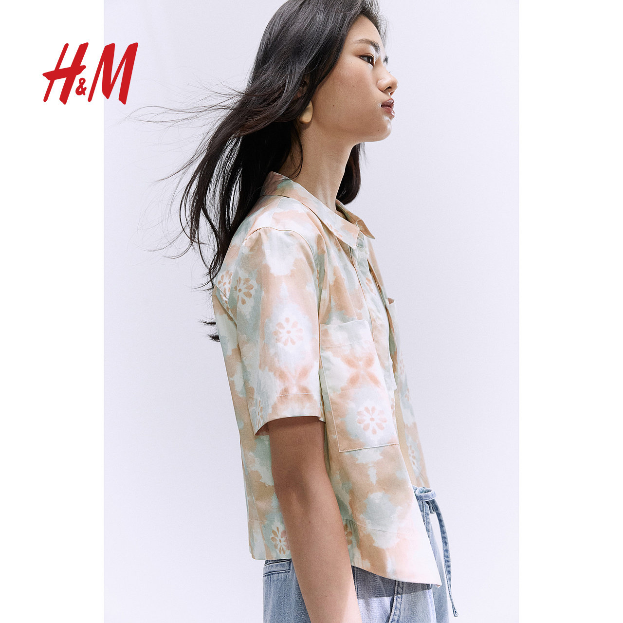 HM女装衬衫冬季休闲舒适印花翻领短袖短款上衣1250775
