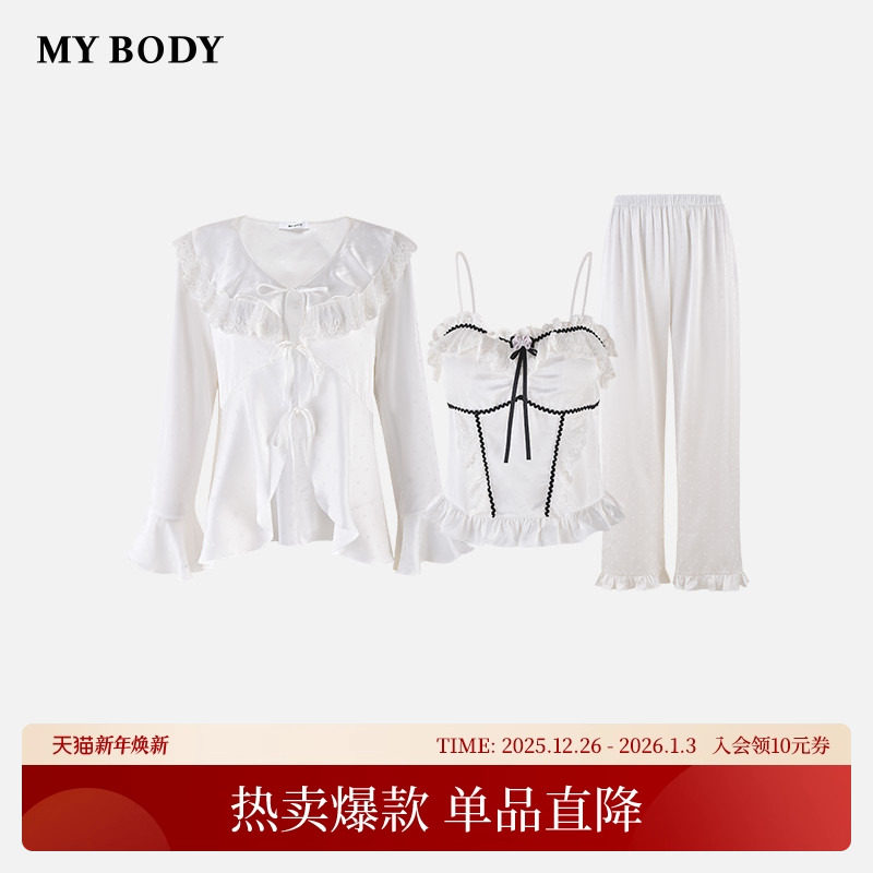 商场同款MYBODY家居服甜美时尚荷叶边点缀吊带长袖开衫睡衣套装女