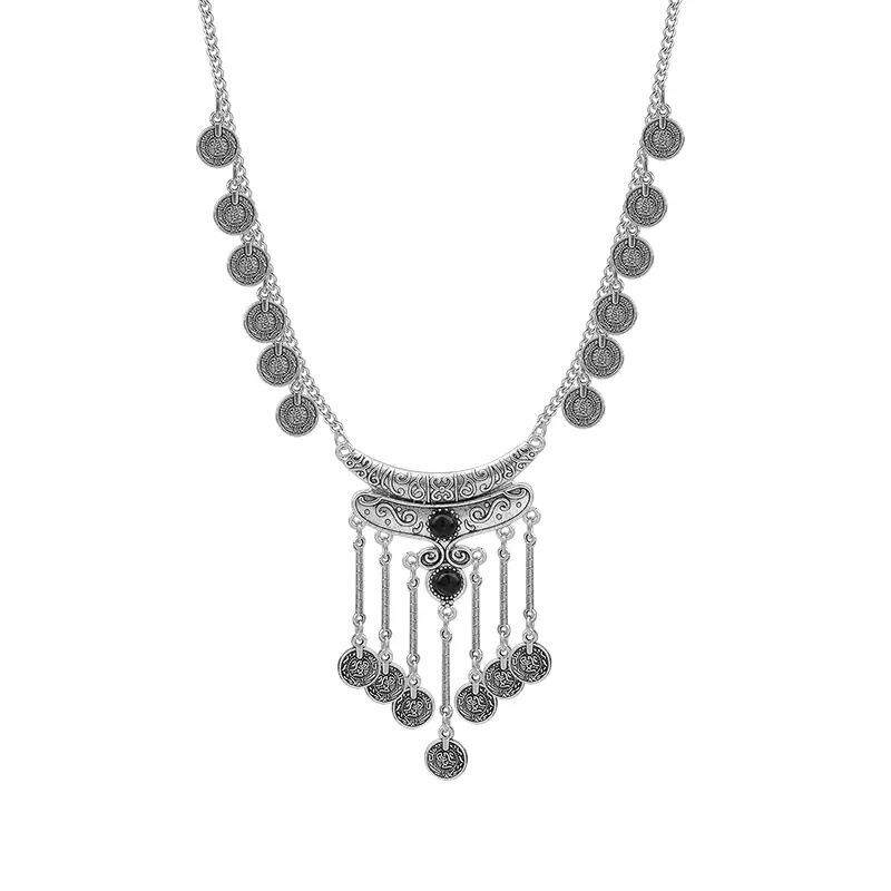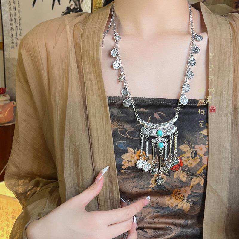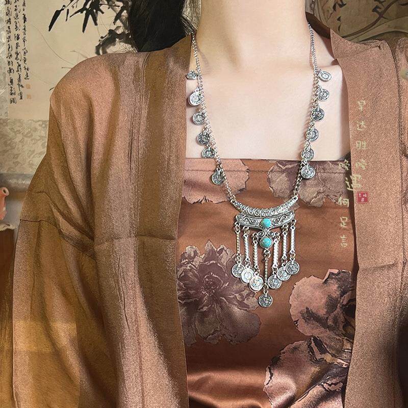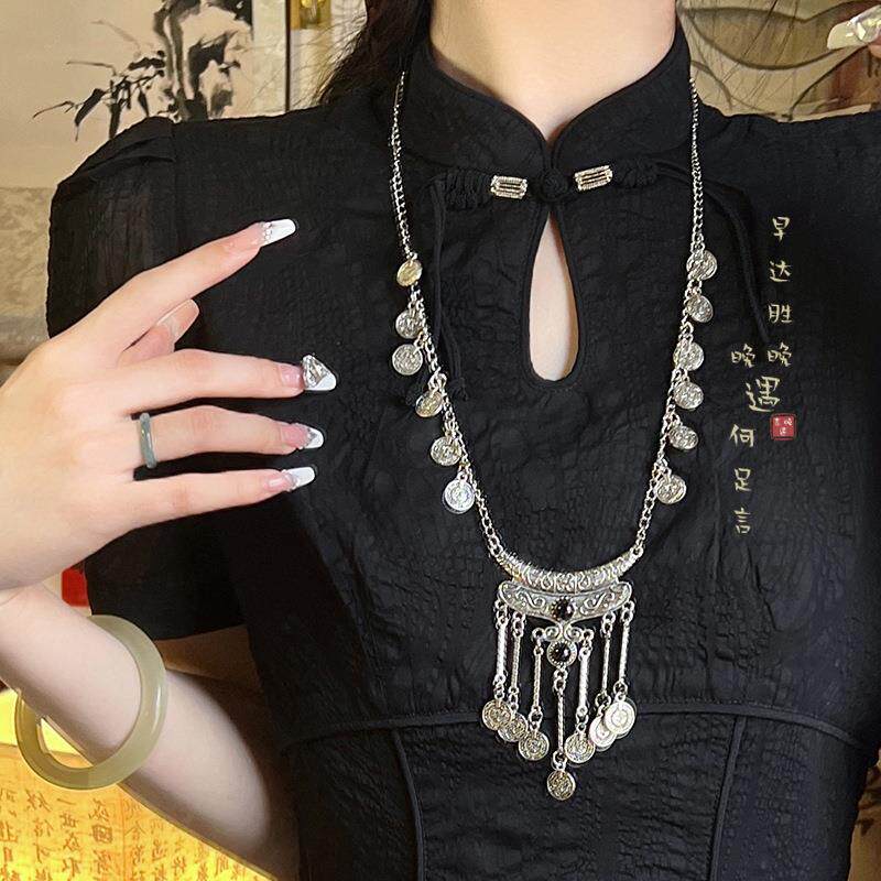 新中式民族风苗疆钱币长款流苏项链复古小众高级感汉服旗袍配饰品