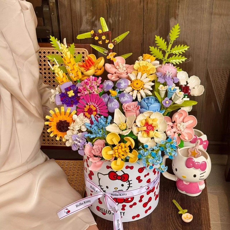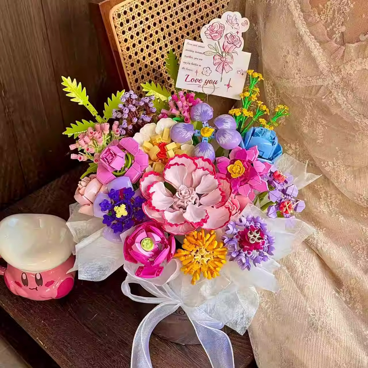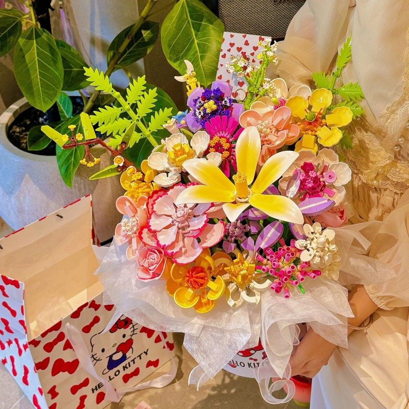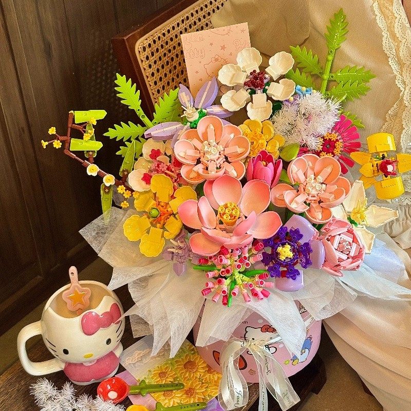 积木花抱抱桶七彩玫瑰花束手工拼装diy全套材料送男女生节日礼物