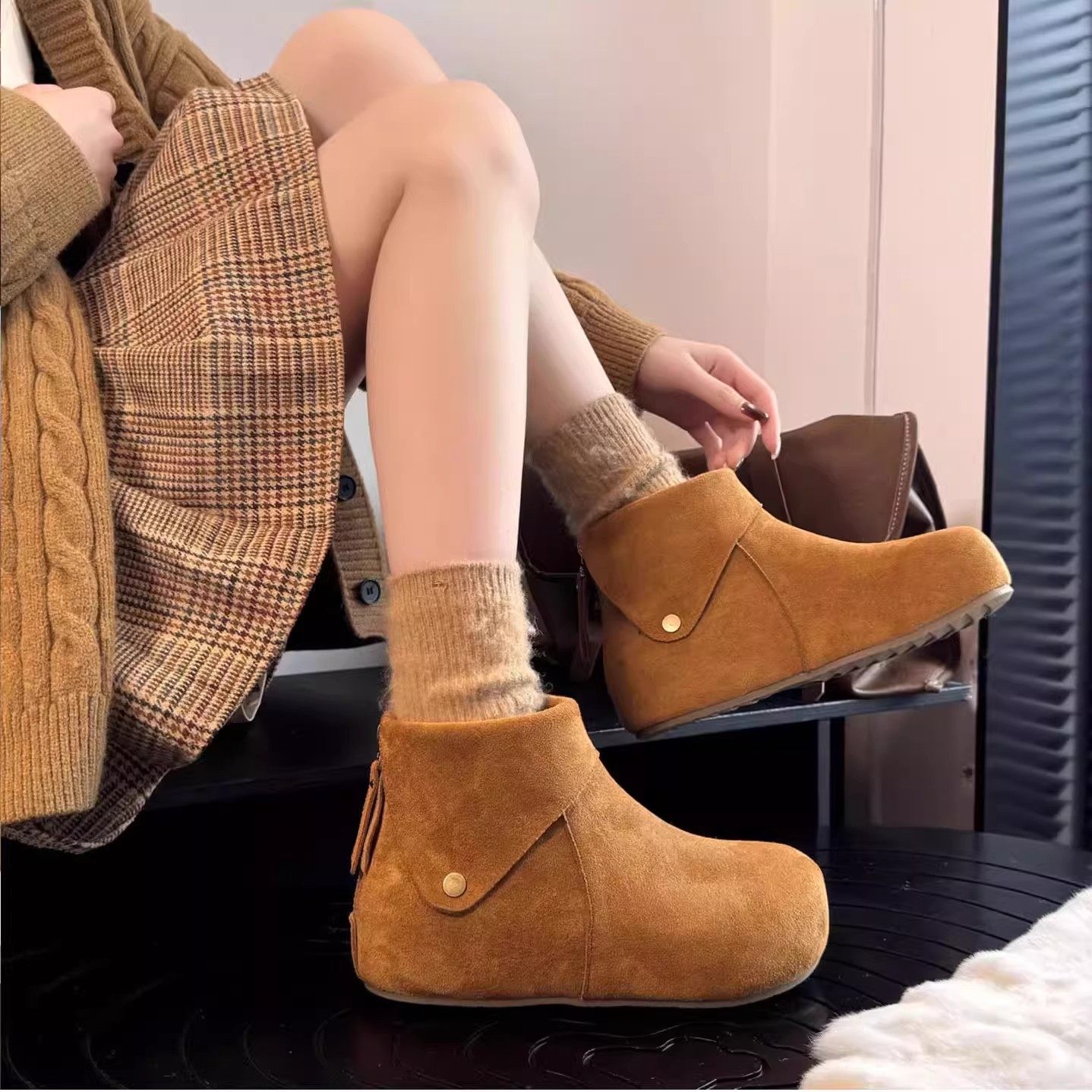 miu家厚底雪地靴女冬季真皮短靴羊毛侧拉链增高厚底加绒毛毛棉鞋