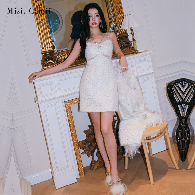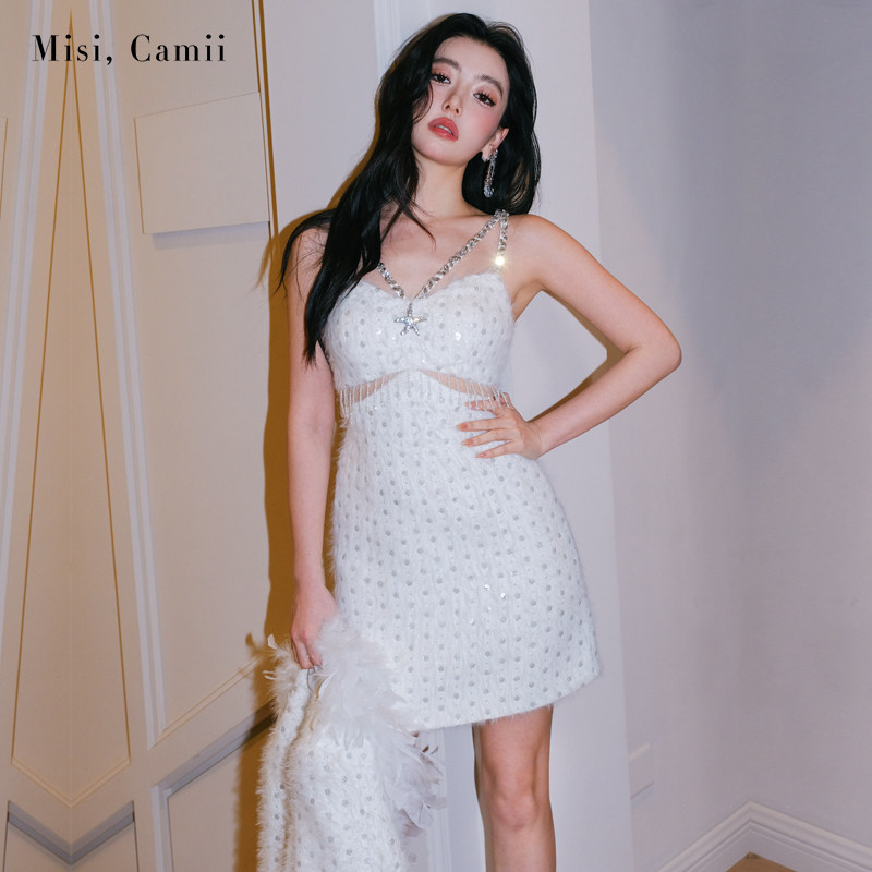 Misi.Camii2024新款女士名媛时尚性感镂空腰流苏吊带短款连衣裙