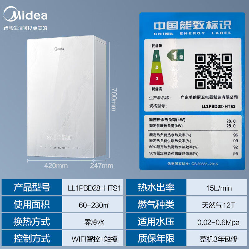 【新一级冷凝零冷水】美的燃气壁挂炉天然气家用锅炉采暖地暖HTS1