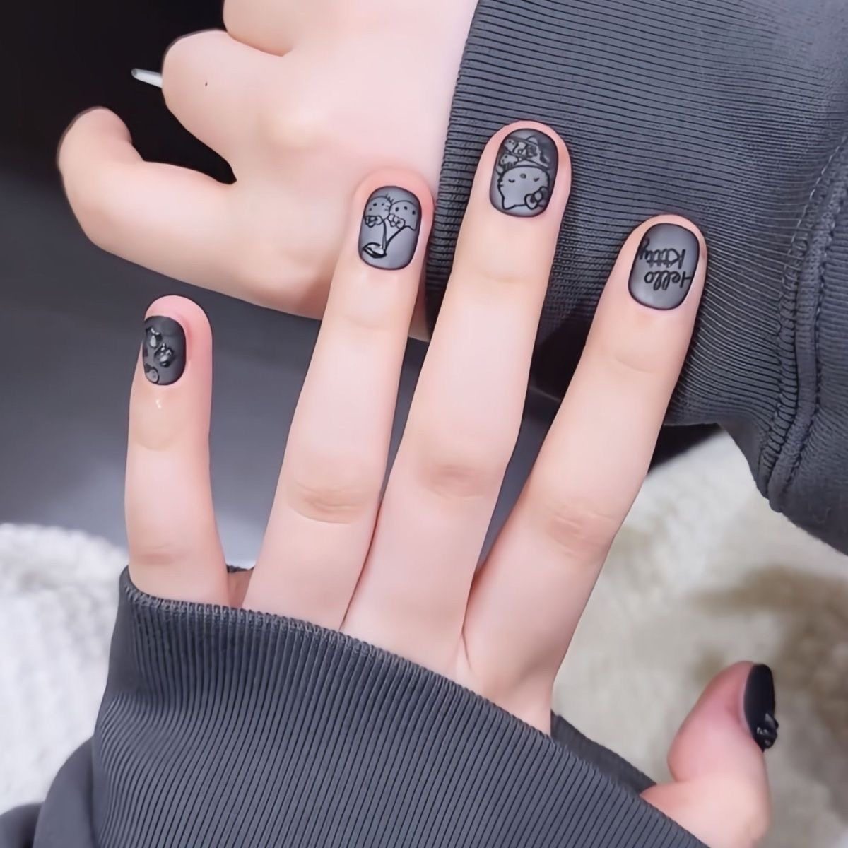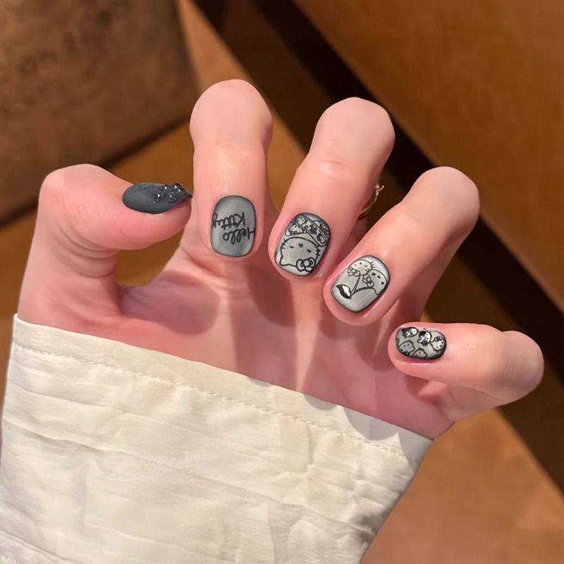 穿戴甲短款美甲手工黑色磨砂猫眼可爱法式显白ins新年黑皮甲油胶