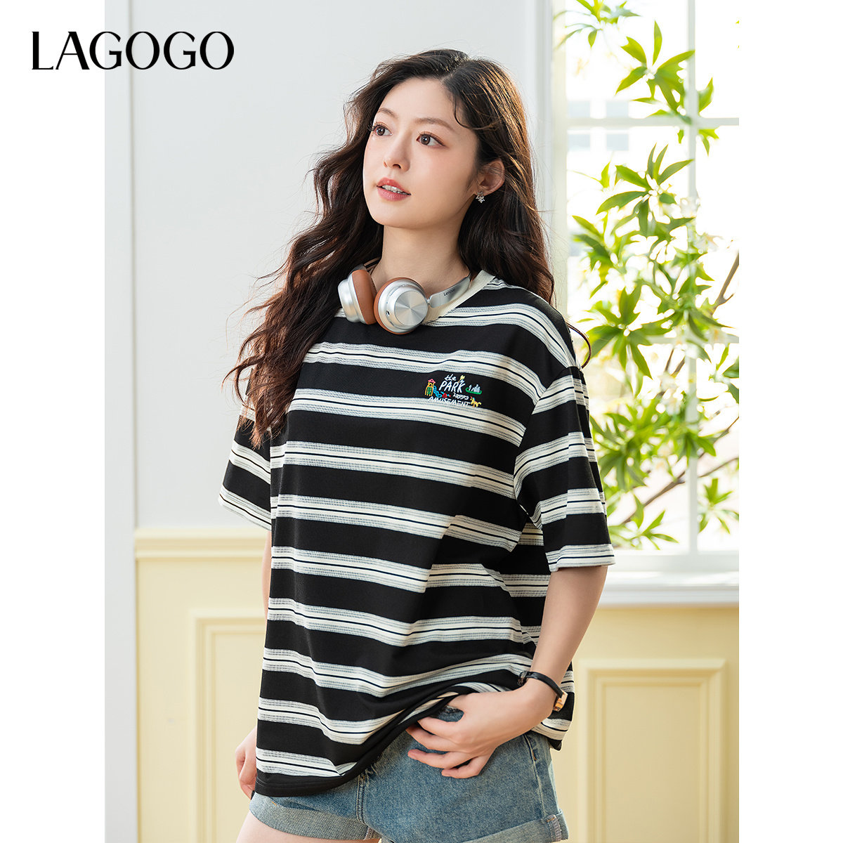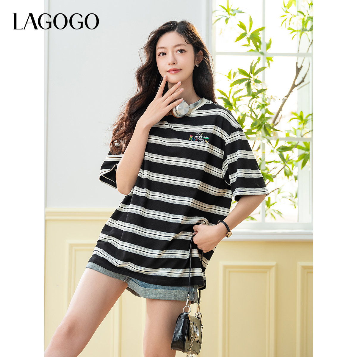 LAGOGO航海系条纹T恤女拉谷谷夏季新款百搭宽松短袖上衣