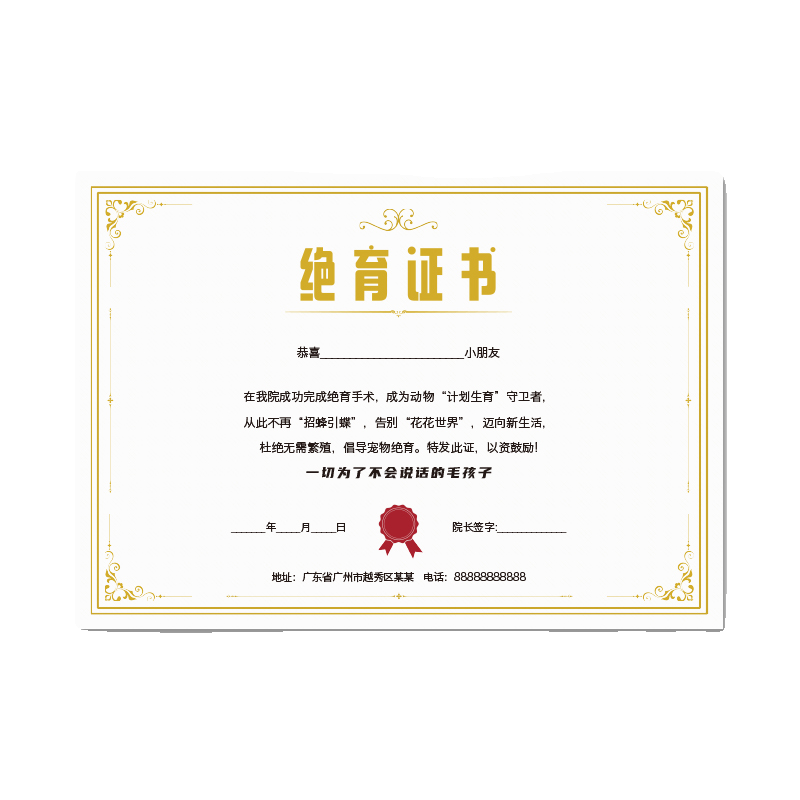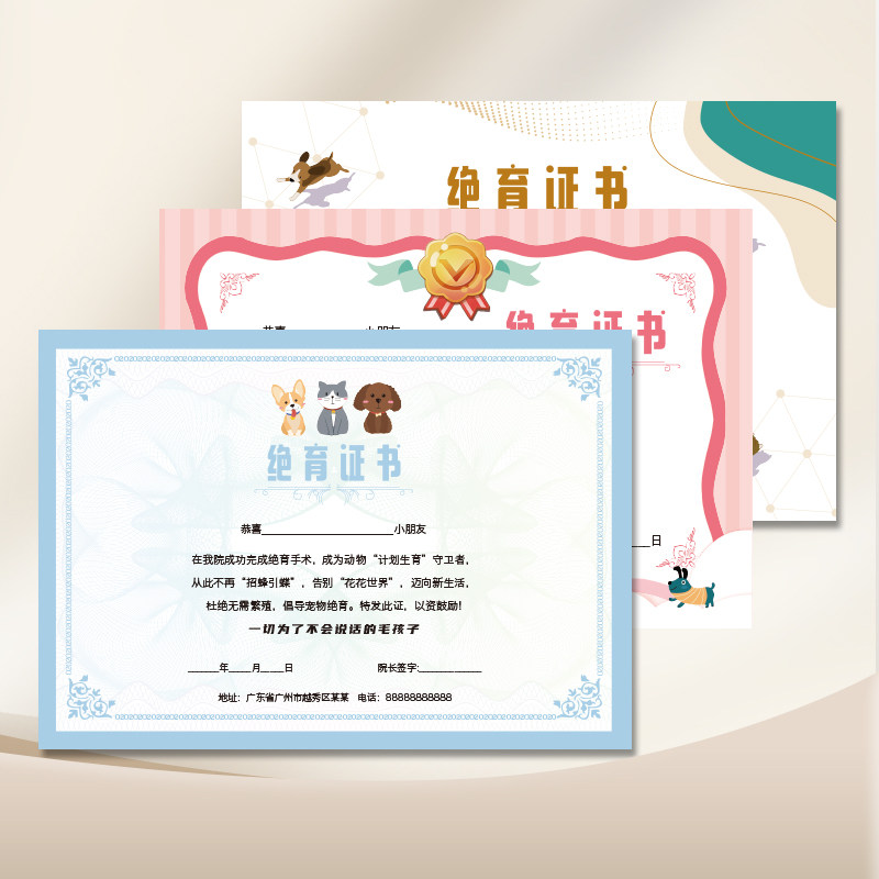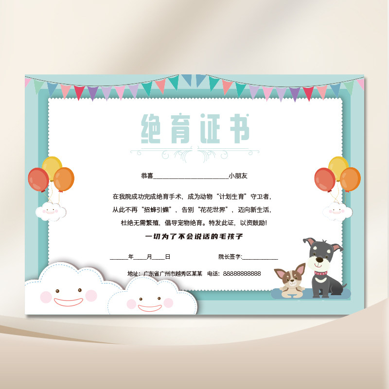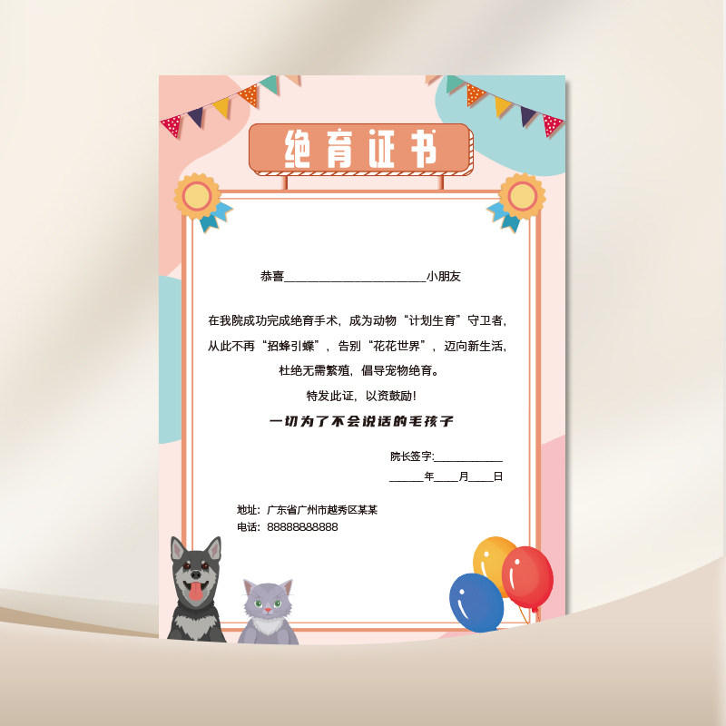 宠物医院犬狗绝育证书奖状定制诊所纪念猫咪大狗计划生育证书定制