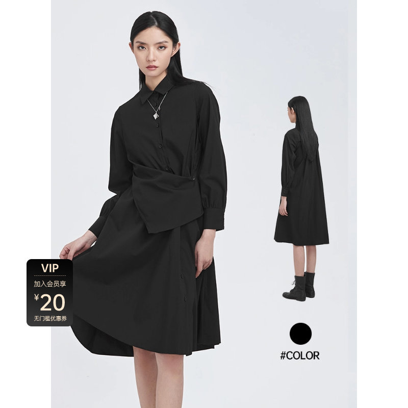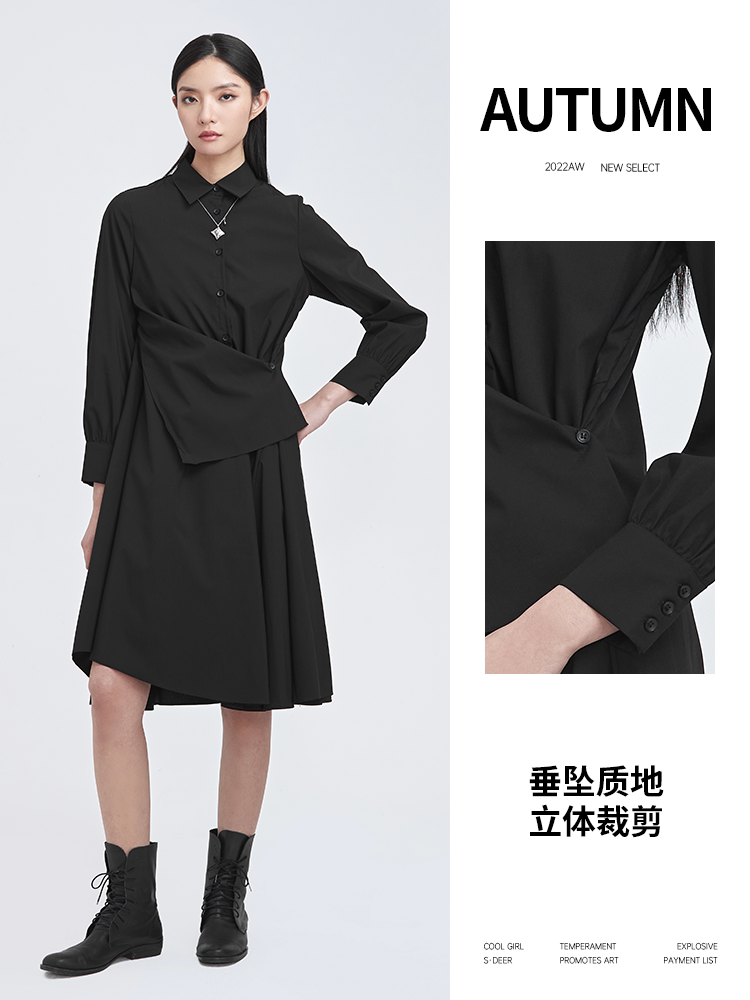 sdeer圣迪奥秋款休闲拼接不规则衬衫黑色长袖连衣裙S22181206