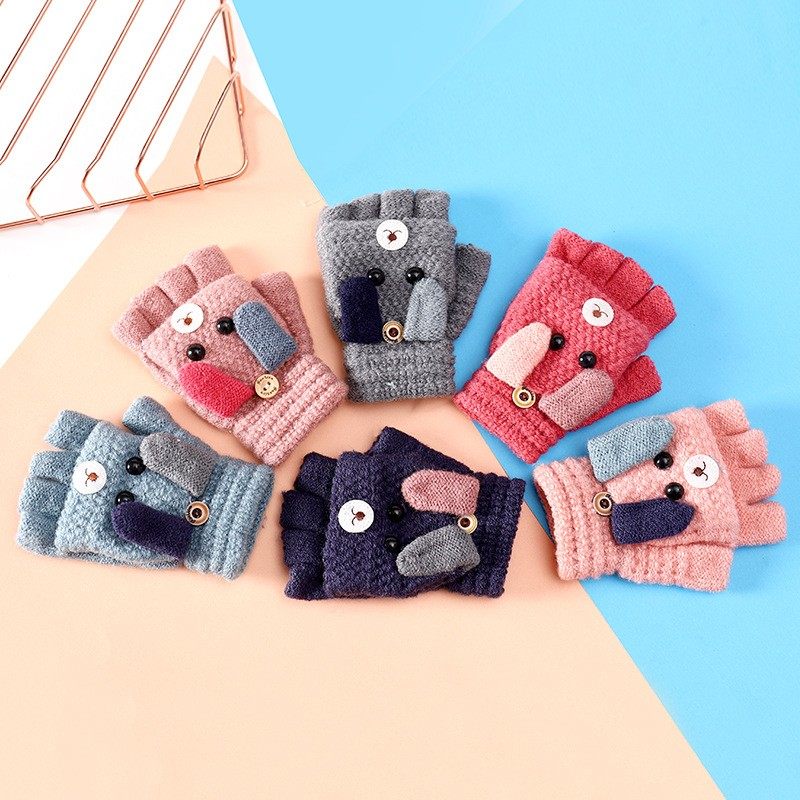 儿童手套半指翻盖冬天季保暖毛绒小学生女孩男童宝宝可爱露指写字