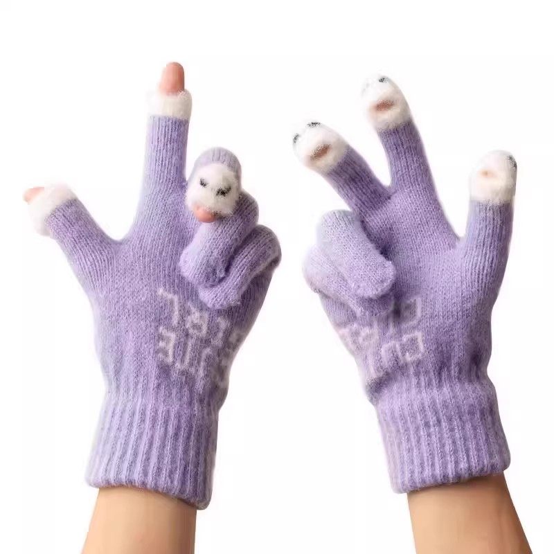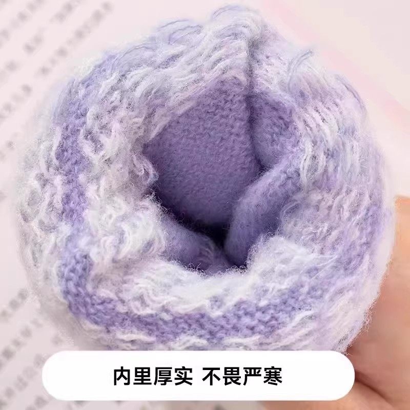 毛线手套女冬季可触屏加绒加厚保暖骑行车五指冬天防寒棉紫色半指