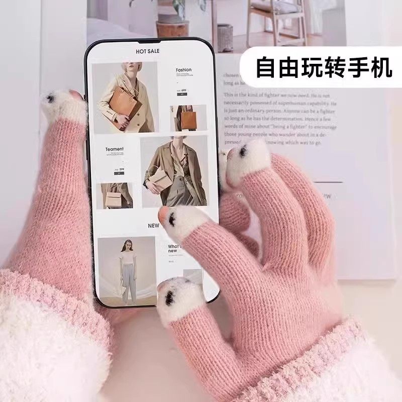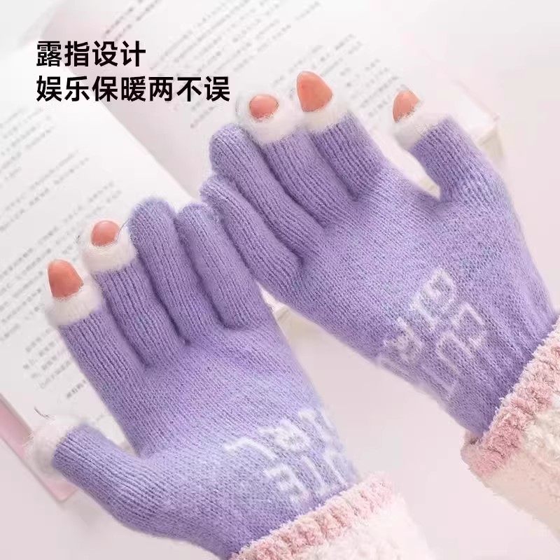 露二指骑行手套保暖冬季触屏韩版毛绒防寒漏指骑车办公写字神器