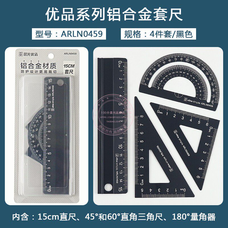 晨光套尺铝合金直尺三角板量角器半圆仪学生绘图测量工具ARLN0459四件套金属尺子直尺套装三角尺学生文具