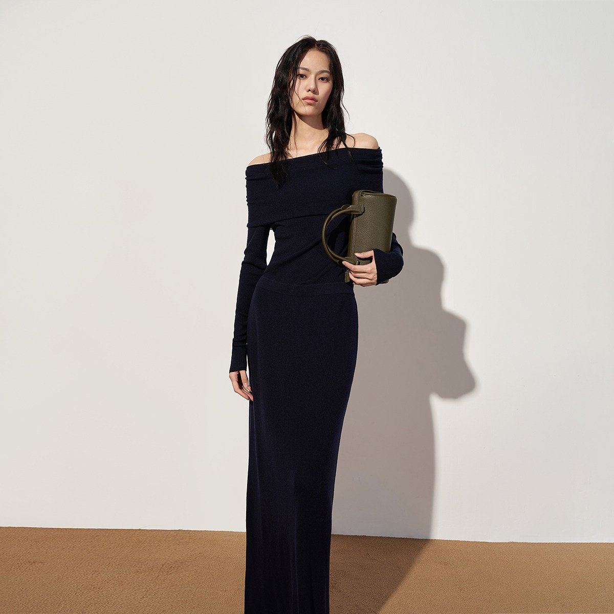 【新品】OCHIRLY欧时力 100%羊毛一字领毛织连衣裙长裙露肩2025秋