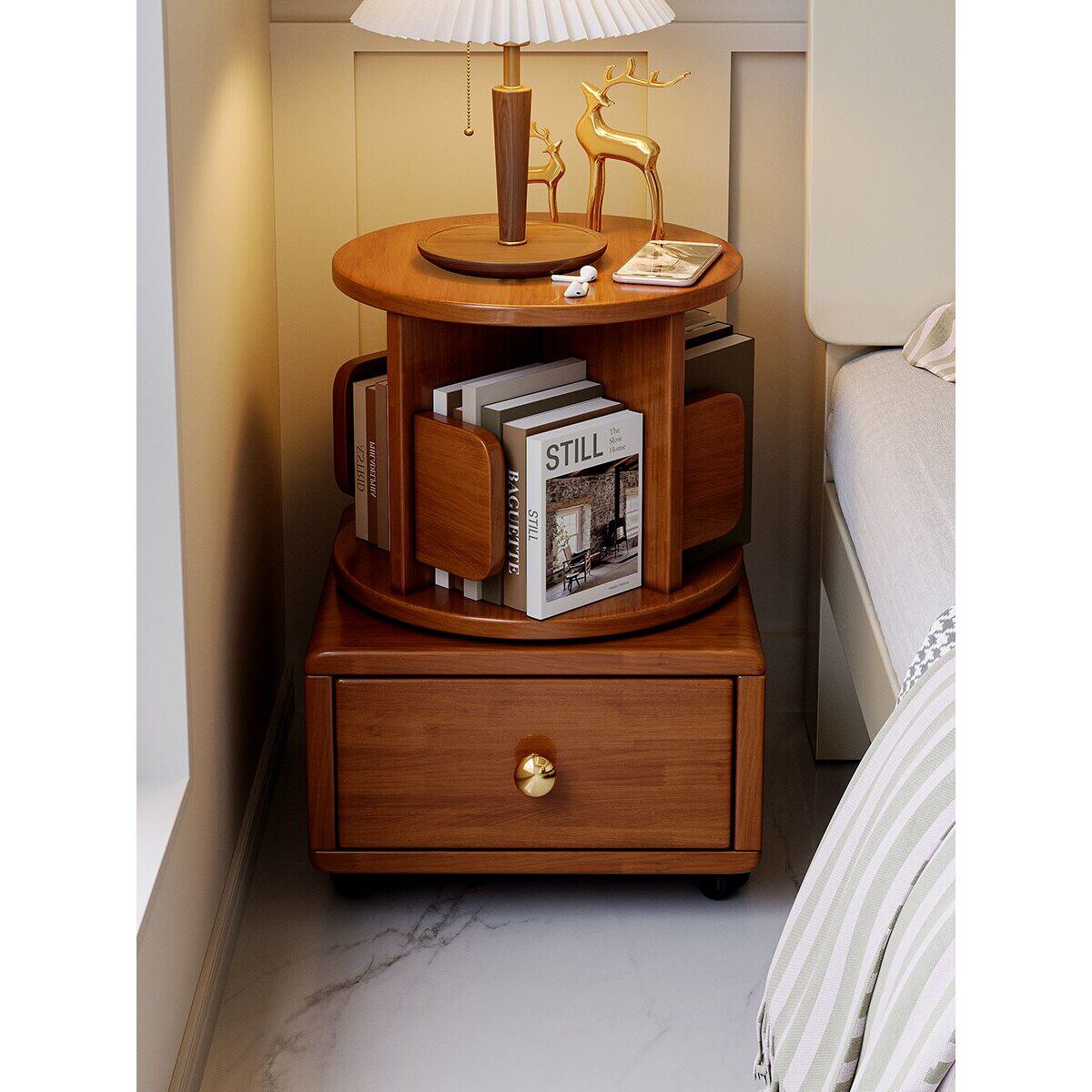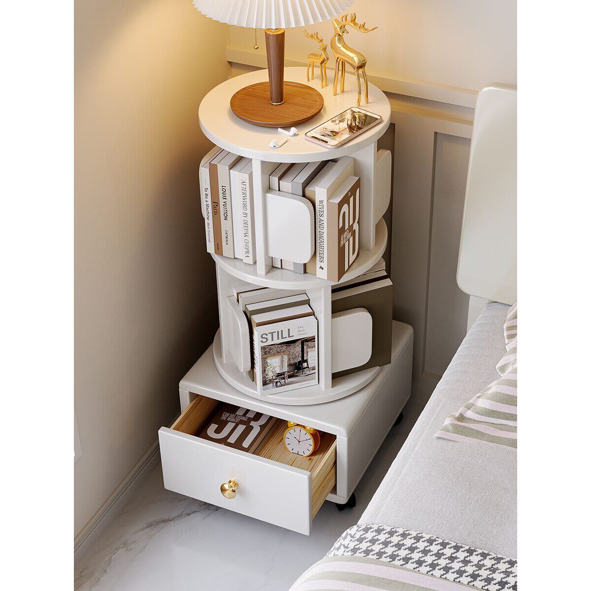 c全实木旋转小书架移动带轮卧室儿童书柜简约床头柜床边收纳置物