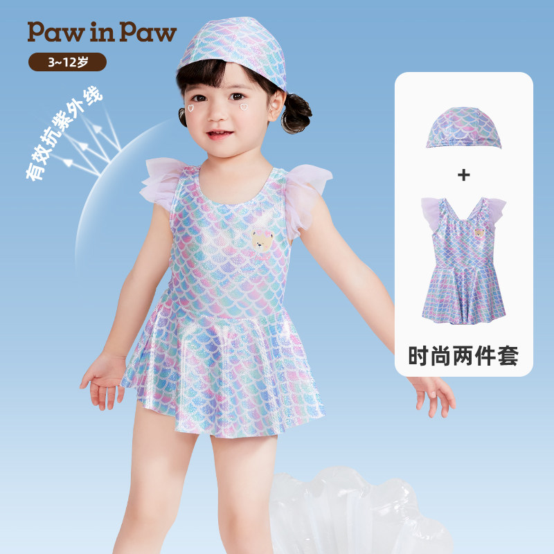 UPF50+防晒PawinPaw卡通小熊童装夏女童儿童泳衣泳帽两件套