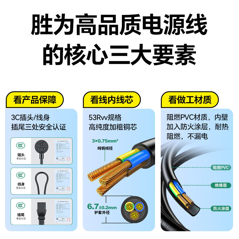 胜为 电源线3c认证国标三芯品字尾 适用台式机电脑显示器主机电饭煲电源连接线打印机1米 APT0010G