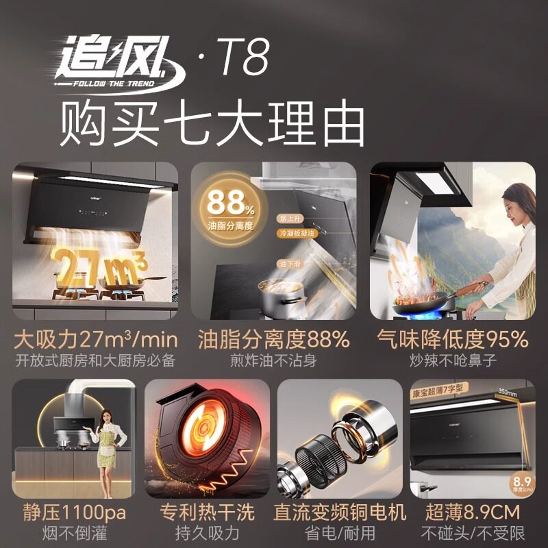 康宝T8油烟机挂式27m³智能清洗吸油烟机家用低噪音变频高效节能