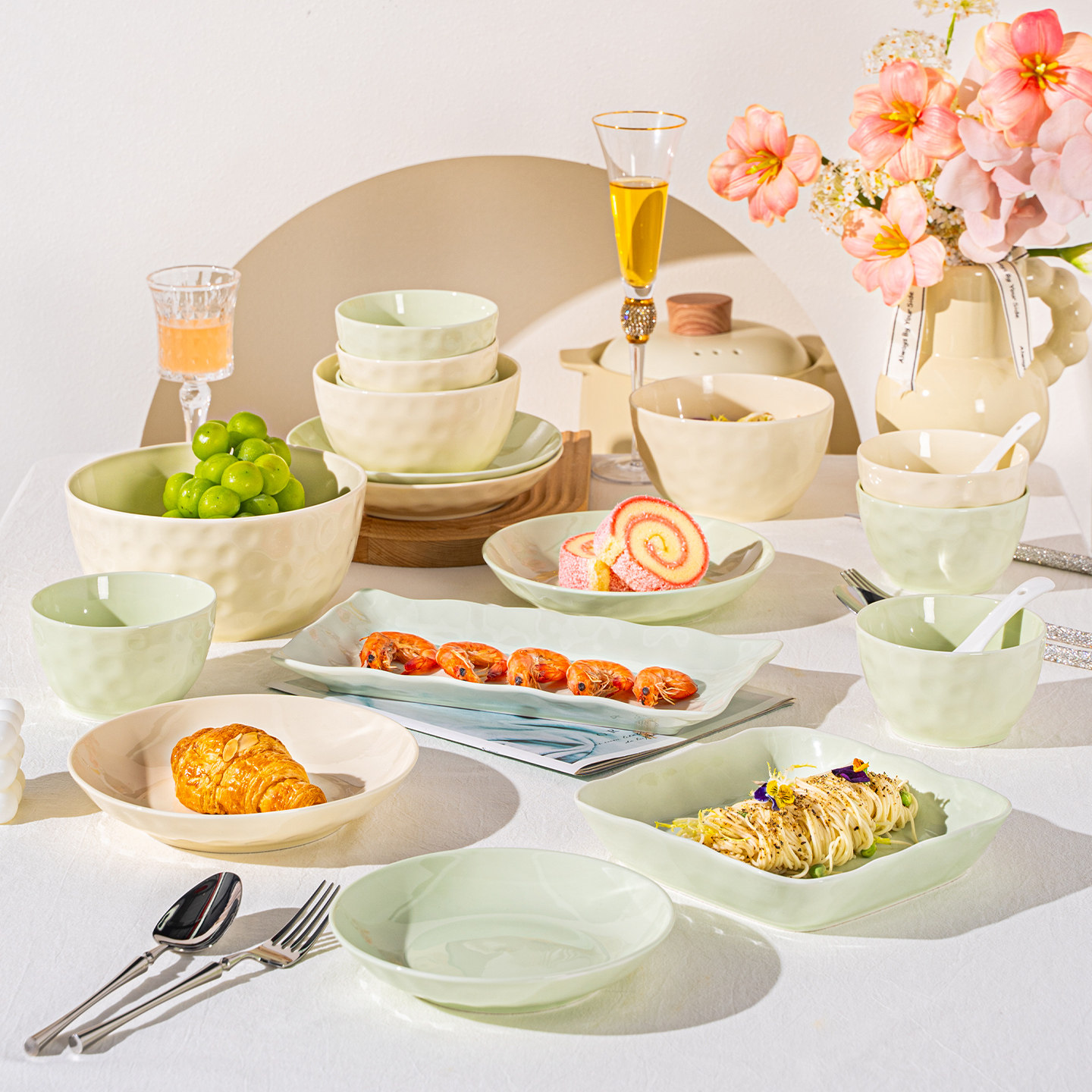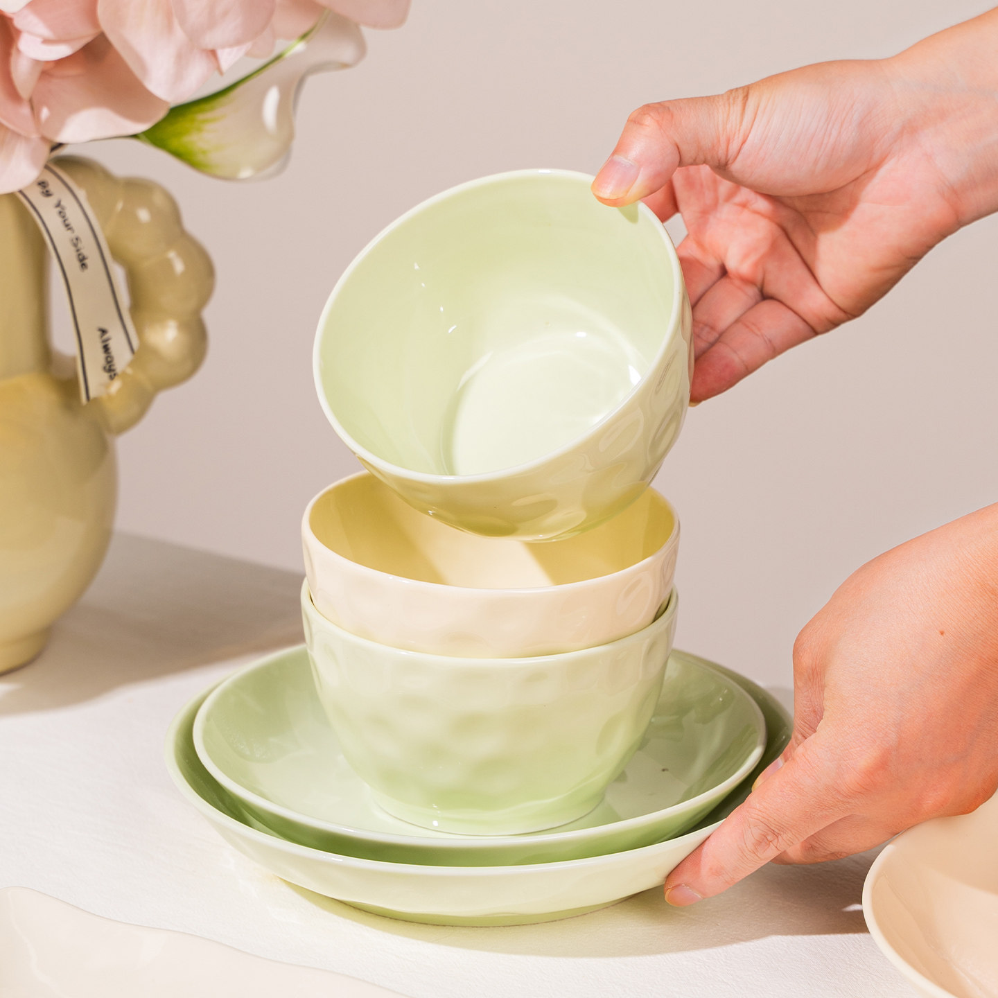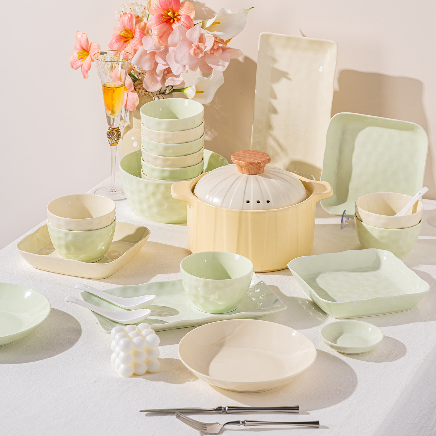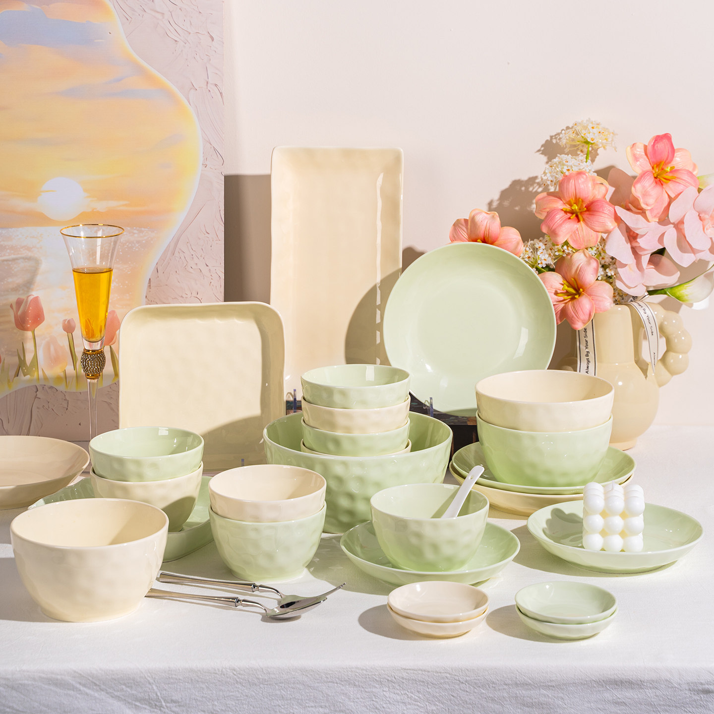 奶油风碗碟套装家用2025新款高颜值陶瓷碗盘筷乔迁釉下彩餐具碗具