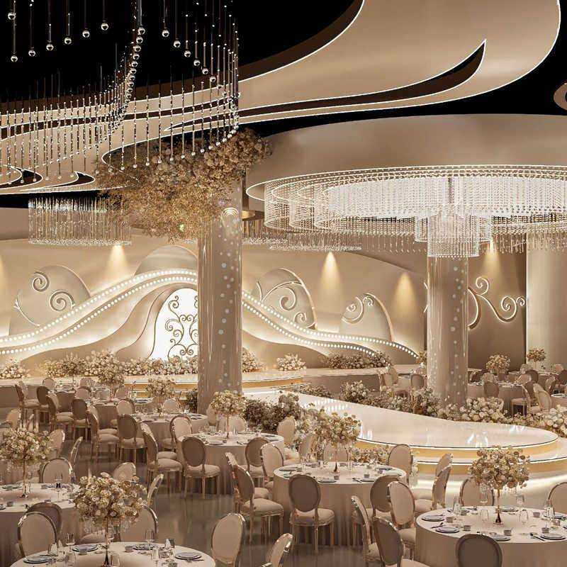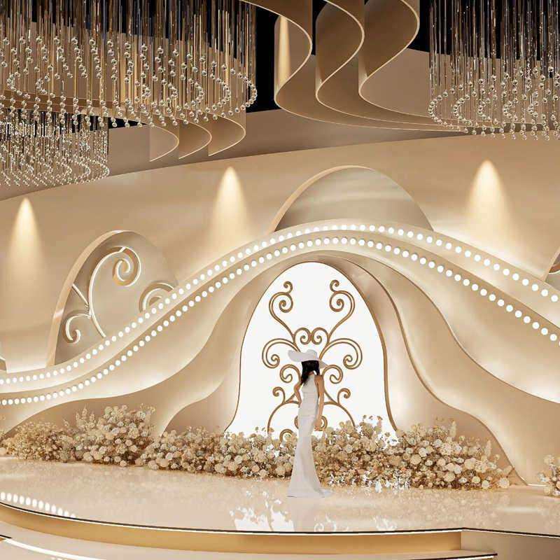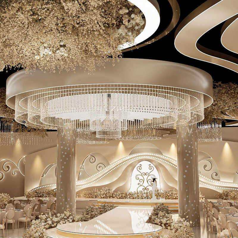 香槟色婚礼堂设计水晶珠帘灯婚庆道具主题设计生产一站式婚礼中山