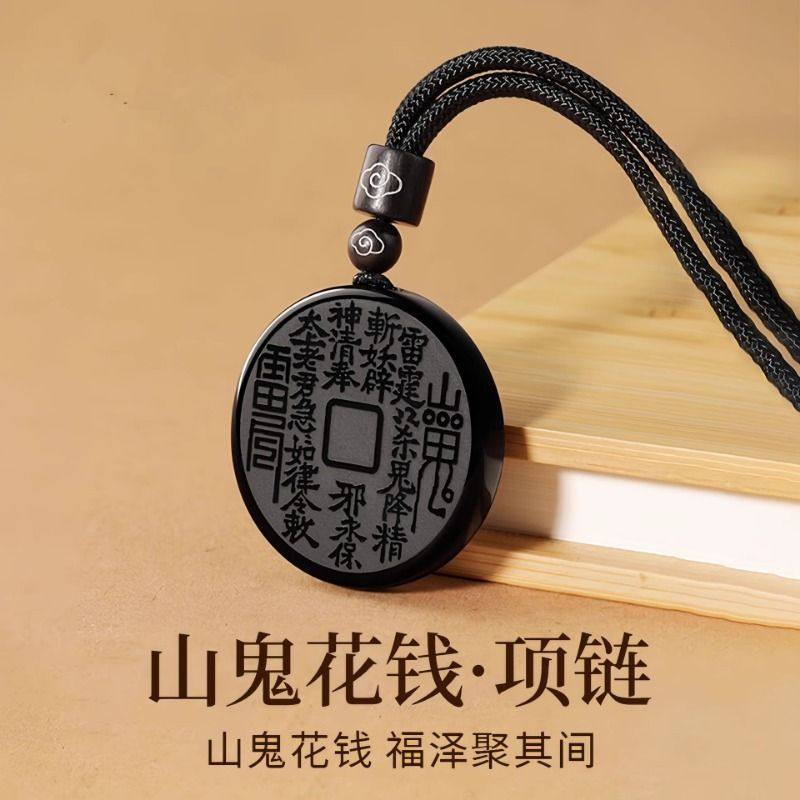 悦卜正品黑曜石山鬼花钱吊坠本命年护身符挂件山花鬼钱项链礼物