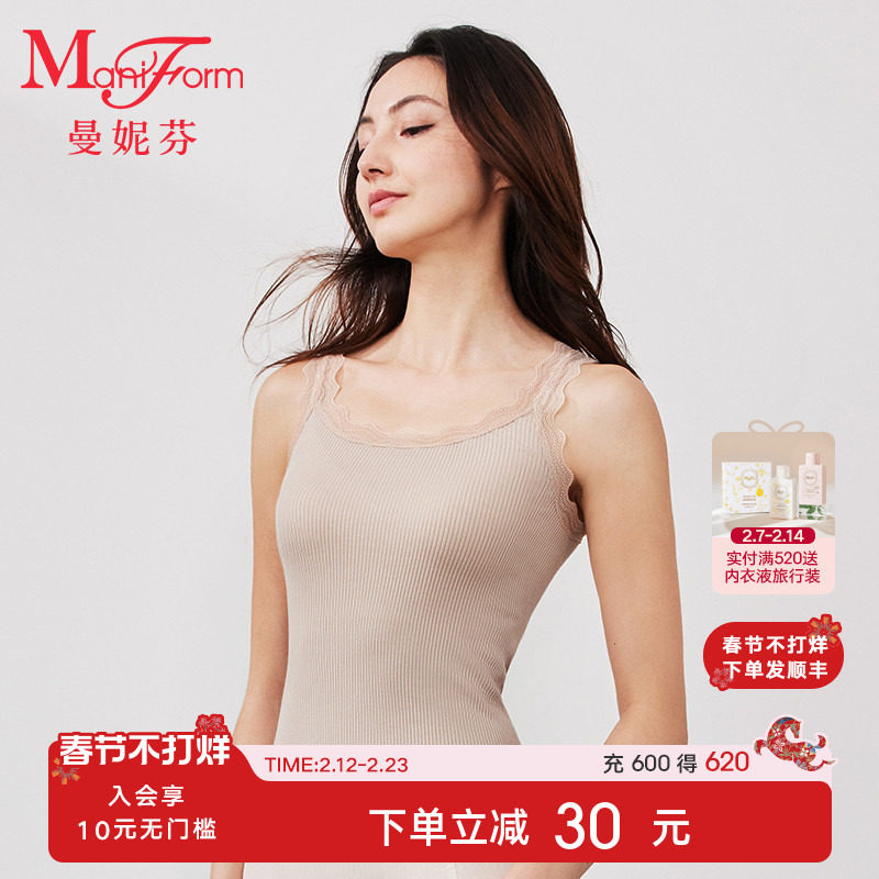 曼妮芬女士天丝罗纹性感蕾丝可外穿打底衫内搭3A抗菌美背打底背心