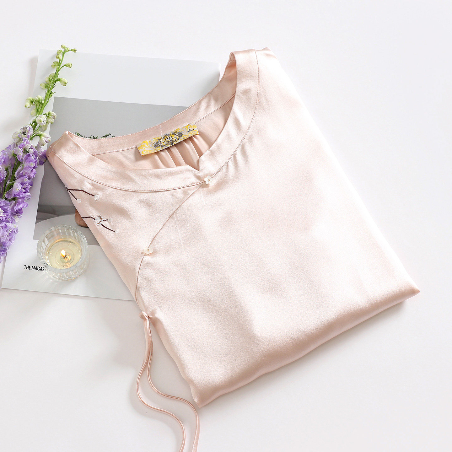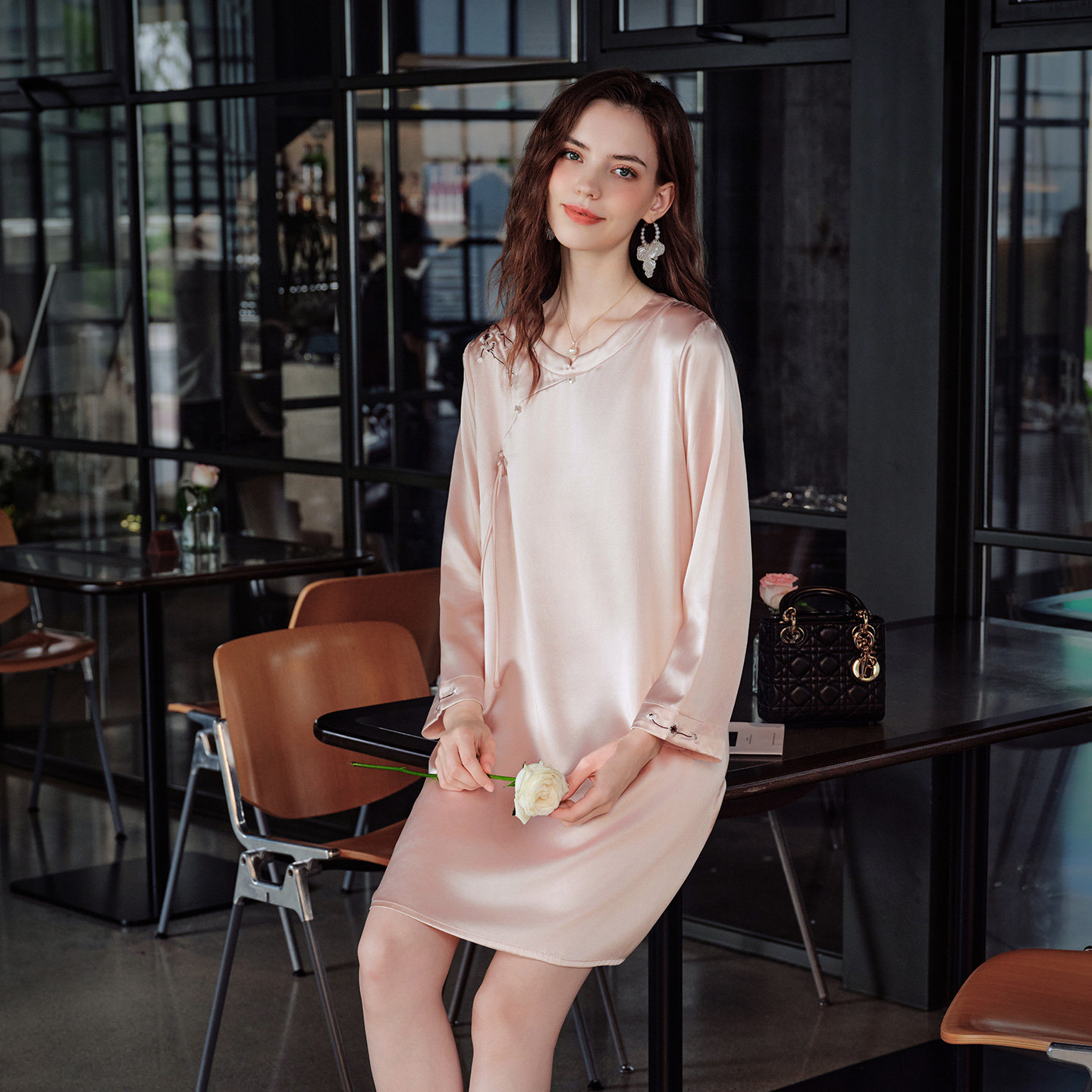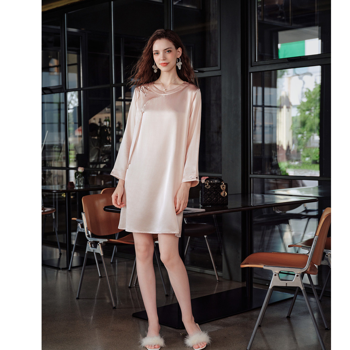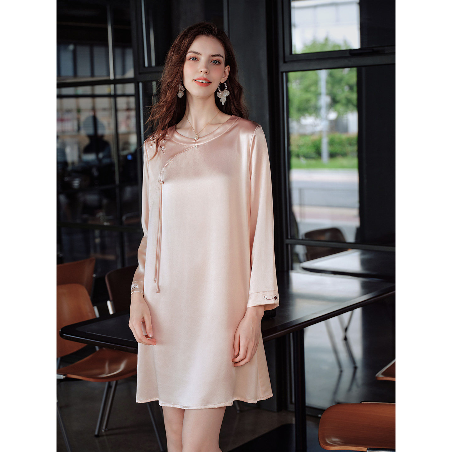 美标春秋新品长袖真丝睡裙女桑蚕丝新中式国风改良家居服丝绸睡衣