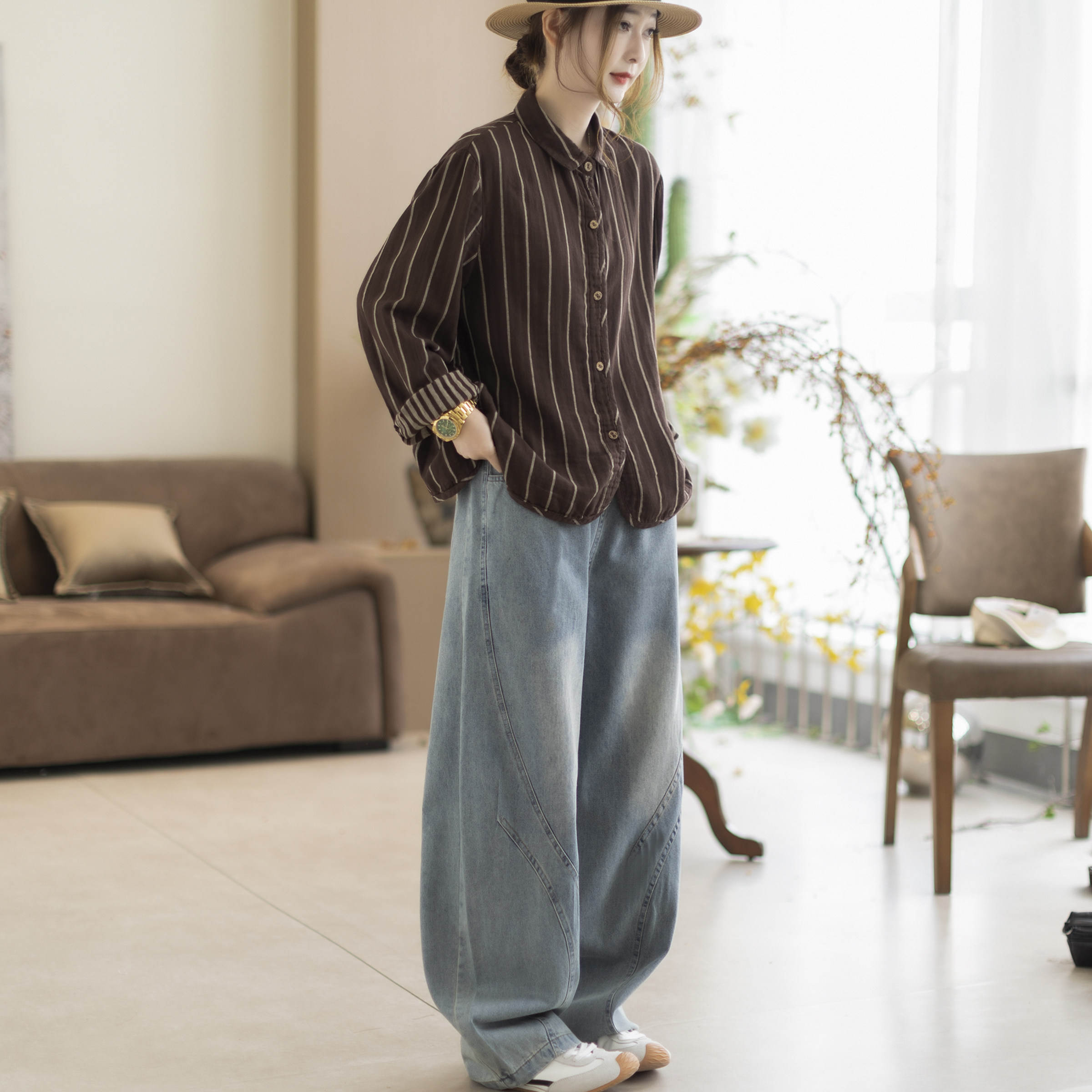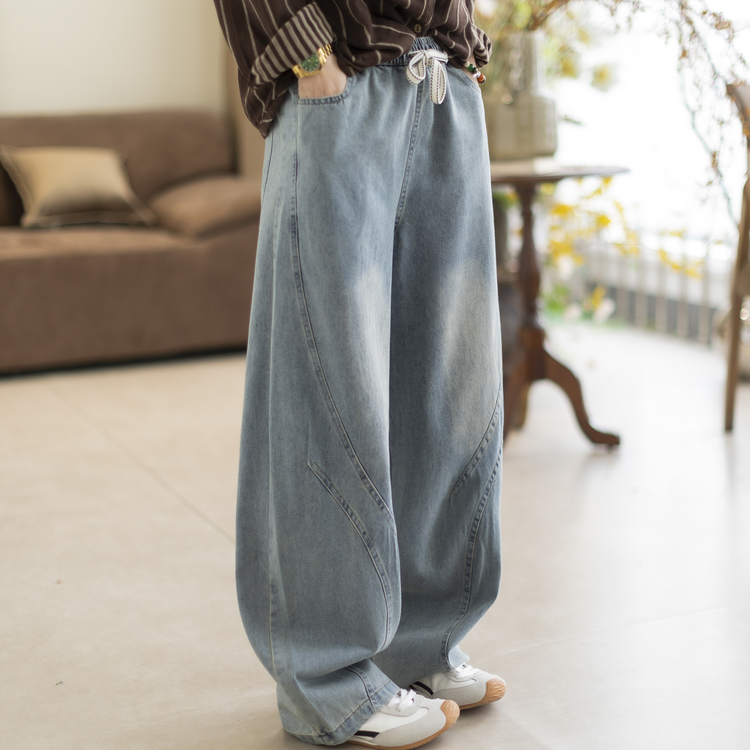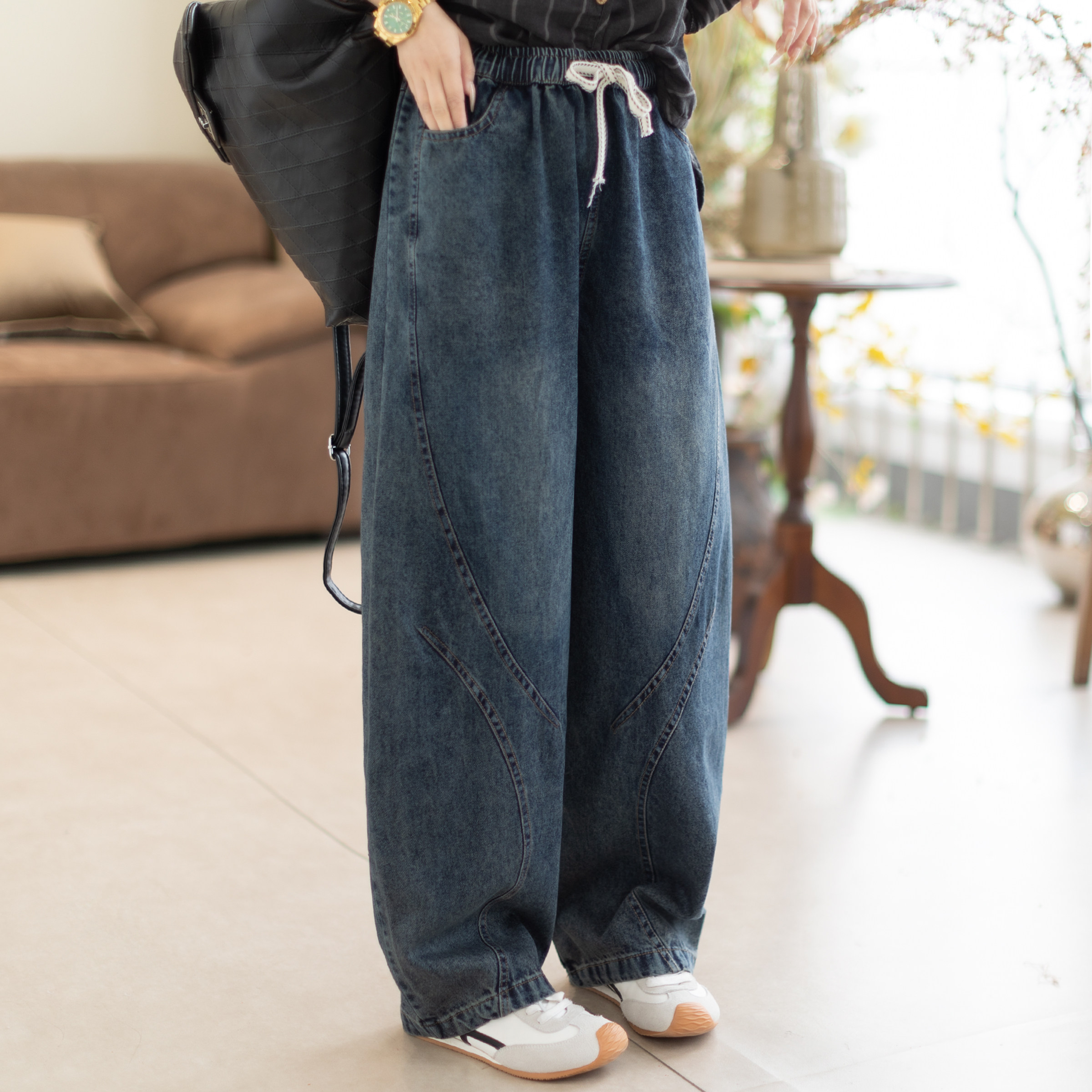 咖咪羽牛仔裤女春秋新款女士水洗休闲简约百搭直筒宽松女装哈伦裤