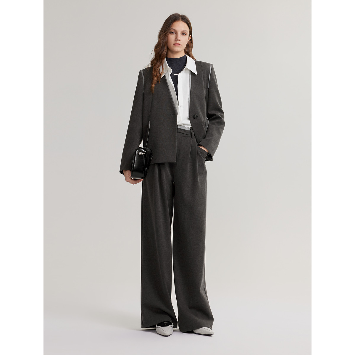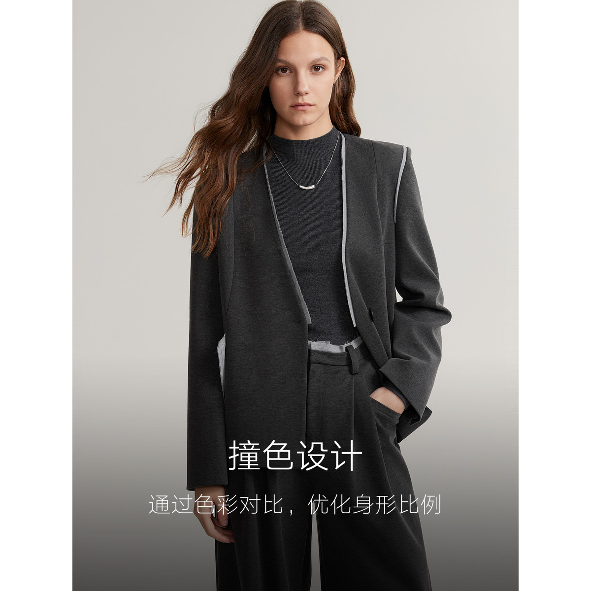 ELLE绵羊毛混纺撞色正肩西装外套2025秋新款高级感休闲气质小西服