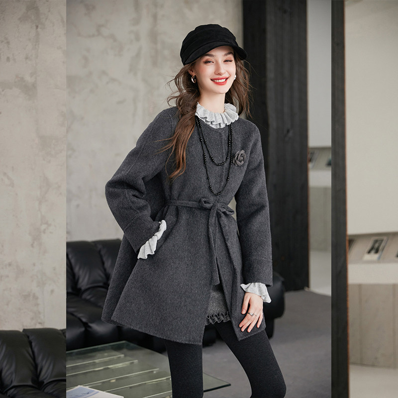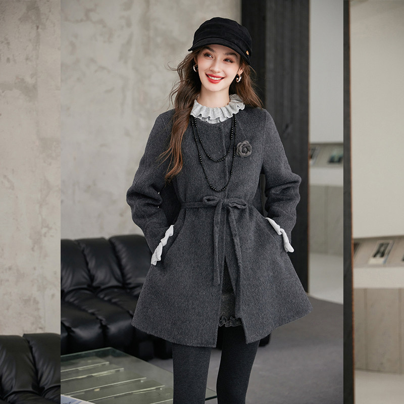 羊毛混纺双面呢 厚款宽松可拆卸花朵系带