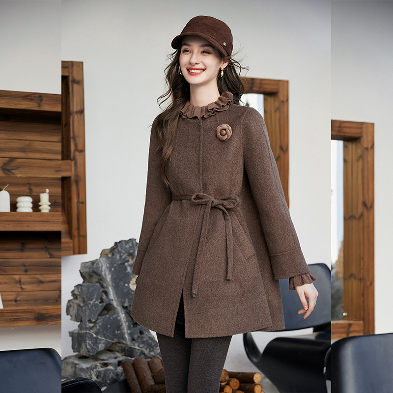 白鹿语千金风羊毛混纺双面呢外套25秋冬新款纯色系带收腰毛呢大衣