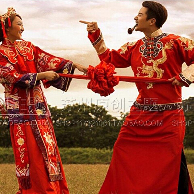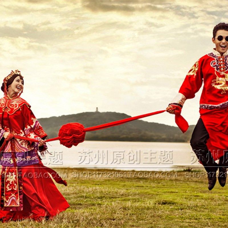 速发新用戏服婚纱摄影拍照道具中式古郎结婚红色绣球大红花婚庆装