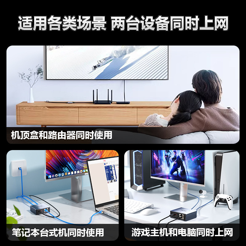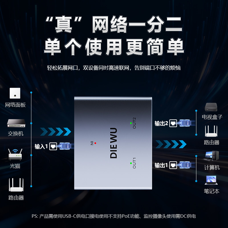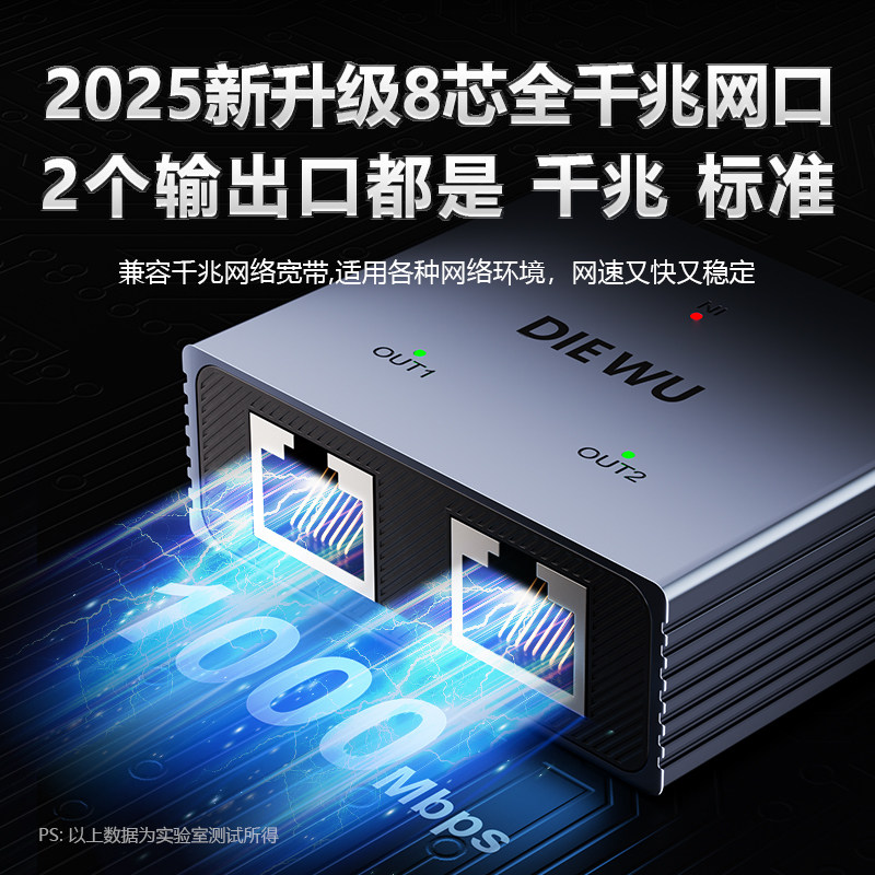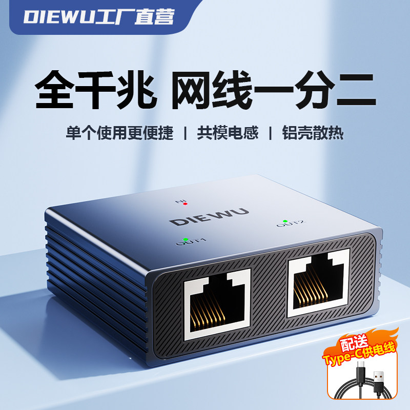 DIEWU网线网口一分二分线器百兆网络铝合金转接千兆一拖二交换机1000MbpsType-C全干兆性价比铝壳散热交换机