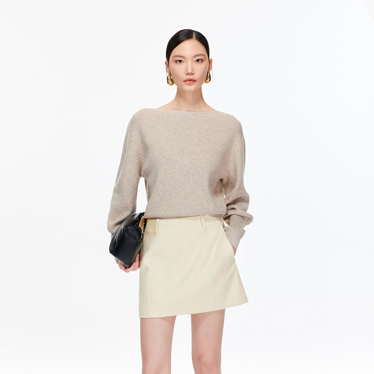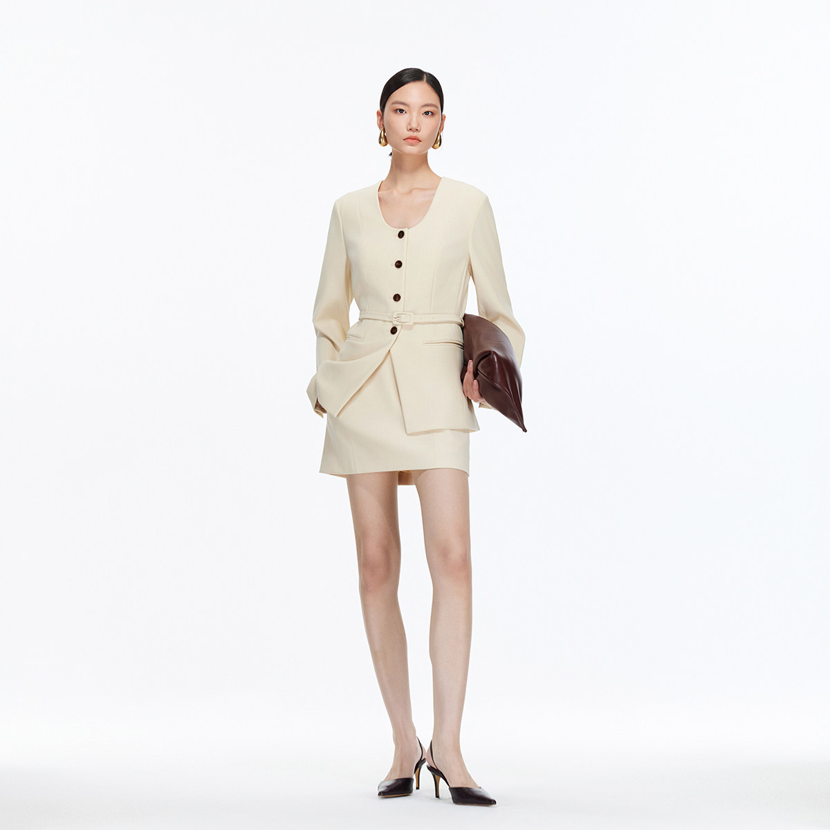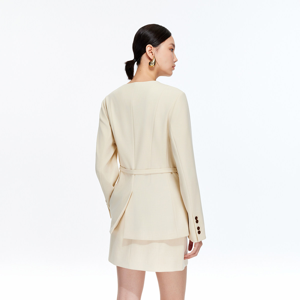 U型领西装,修饰颈部曲线,可拆卸腰带设计