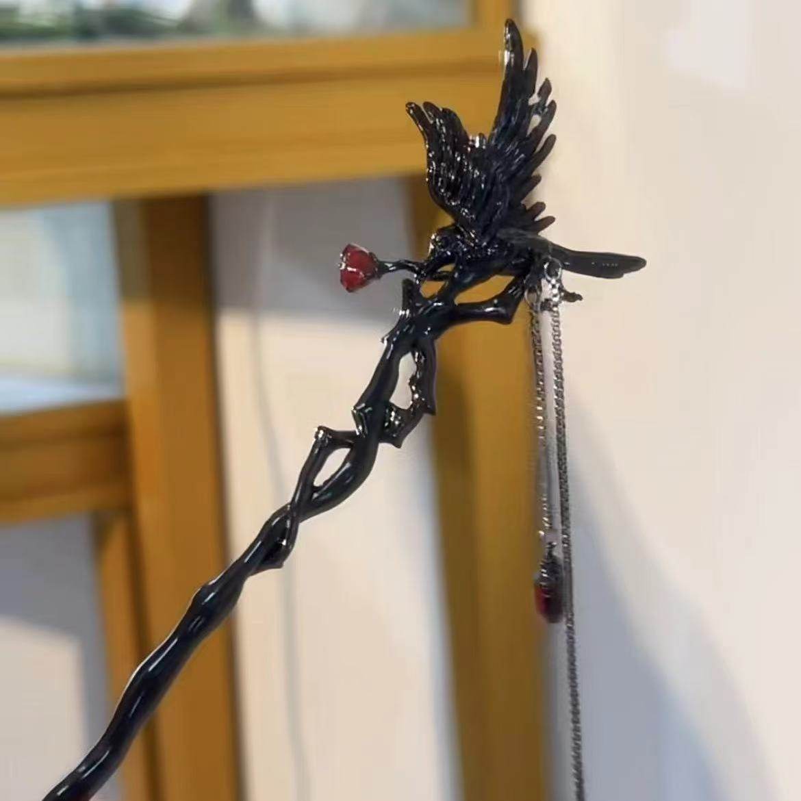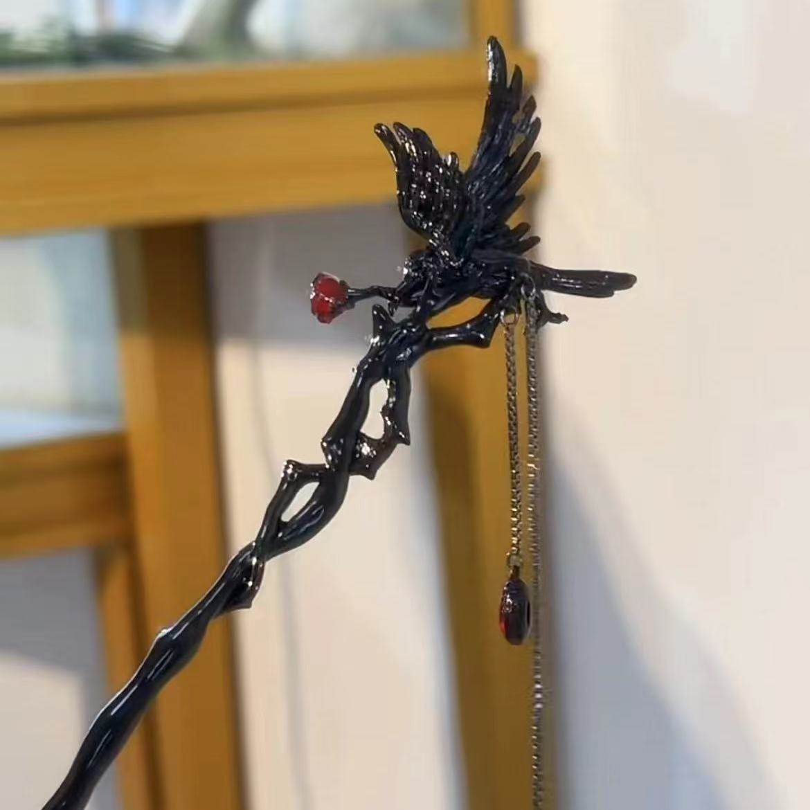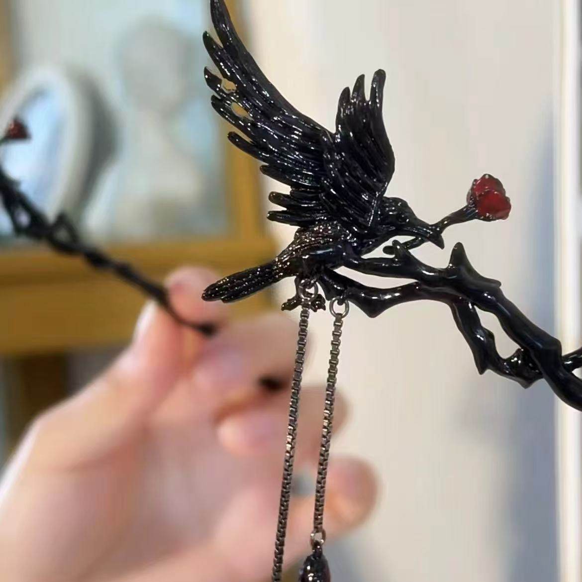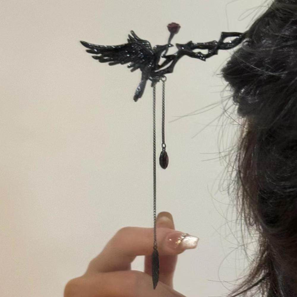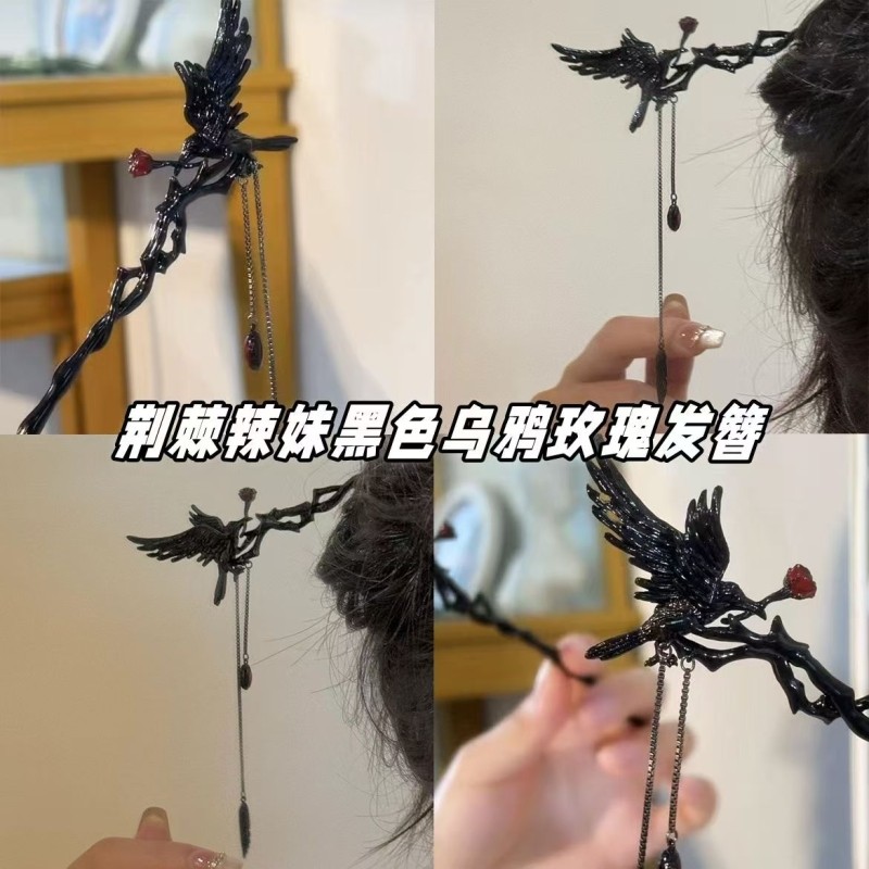 叼着玫瑰的乌鸦~荆棘辣妹黑色乌鸦发簪爆款暗黑小众高级流苏发饰
