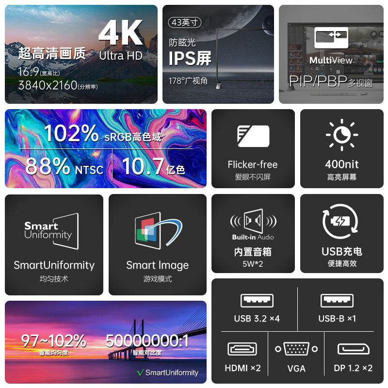 飞利浦438P1 43寸显示器4K高清IPS屏10bit炒股分屏游戏电脑屏幕40
