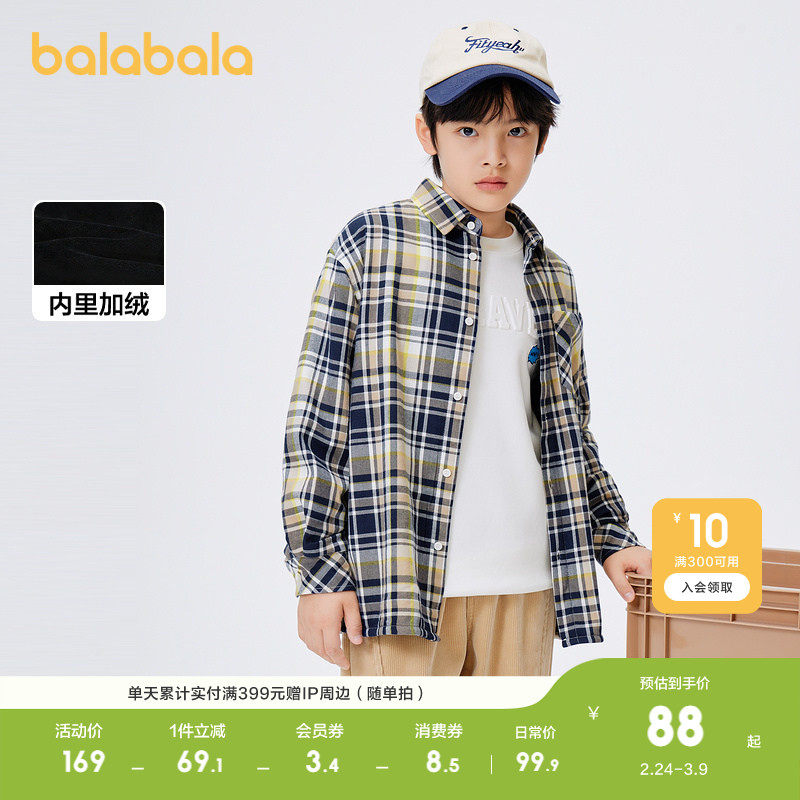 巴拉巴拉童装男童衬衫儿童长袖加绒中大童格子印花衬衣上衣潮休闲
